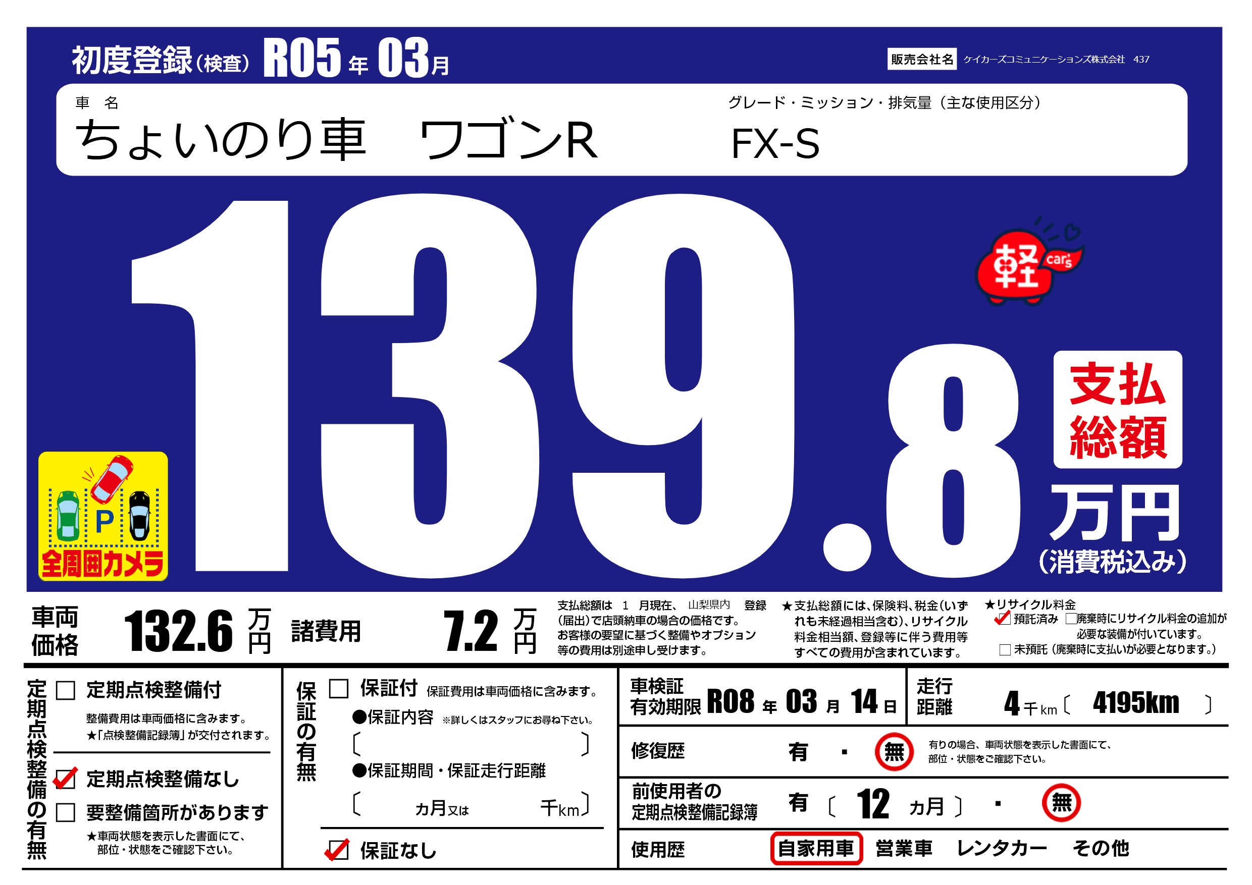 | 車名 | ちょいのり車 ワゴンR | グレード ミッション 排気量 |