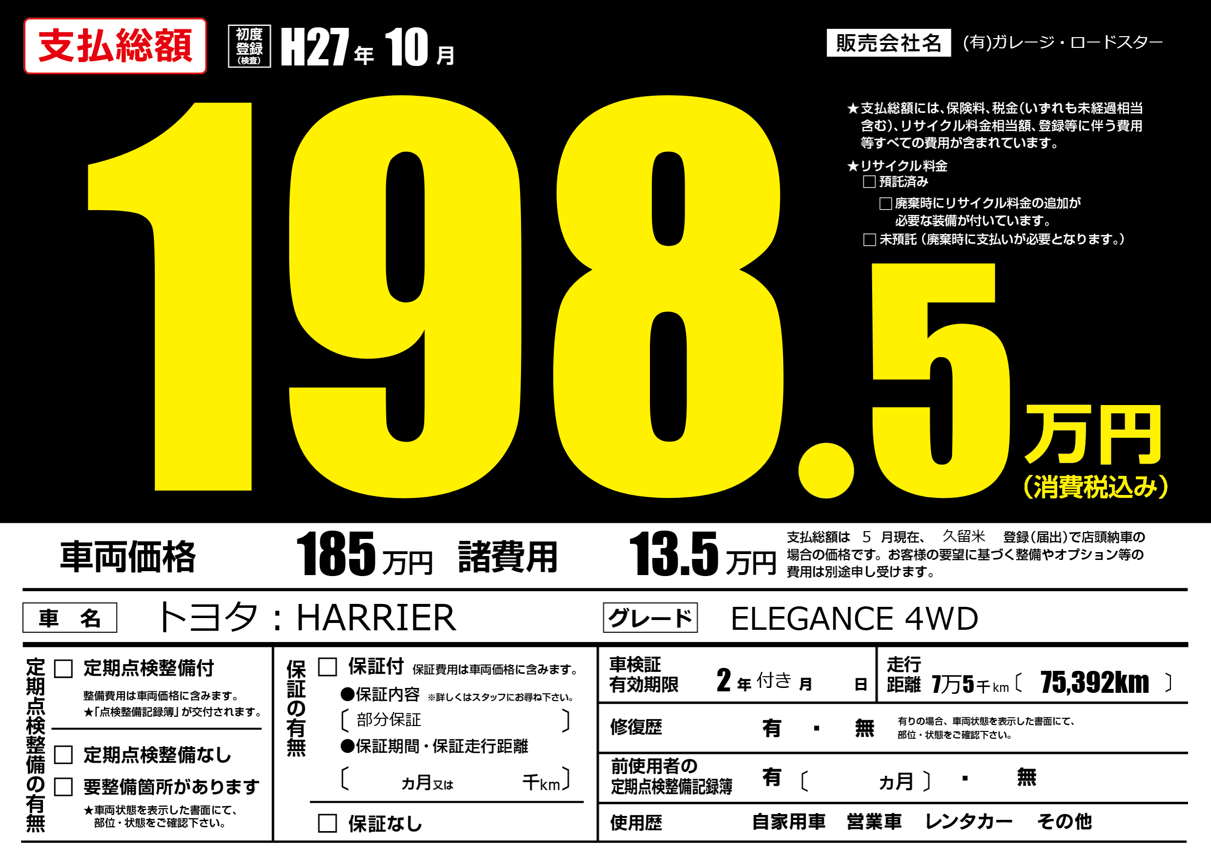 保証なし 保証内容(部分保証) ---ヶ月または()千kmまで |