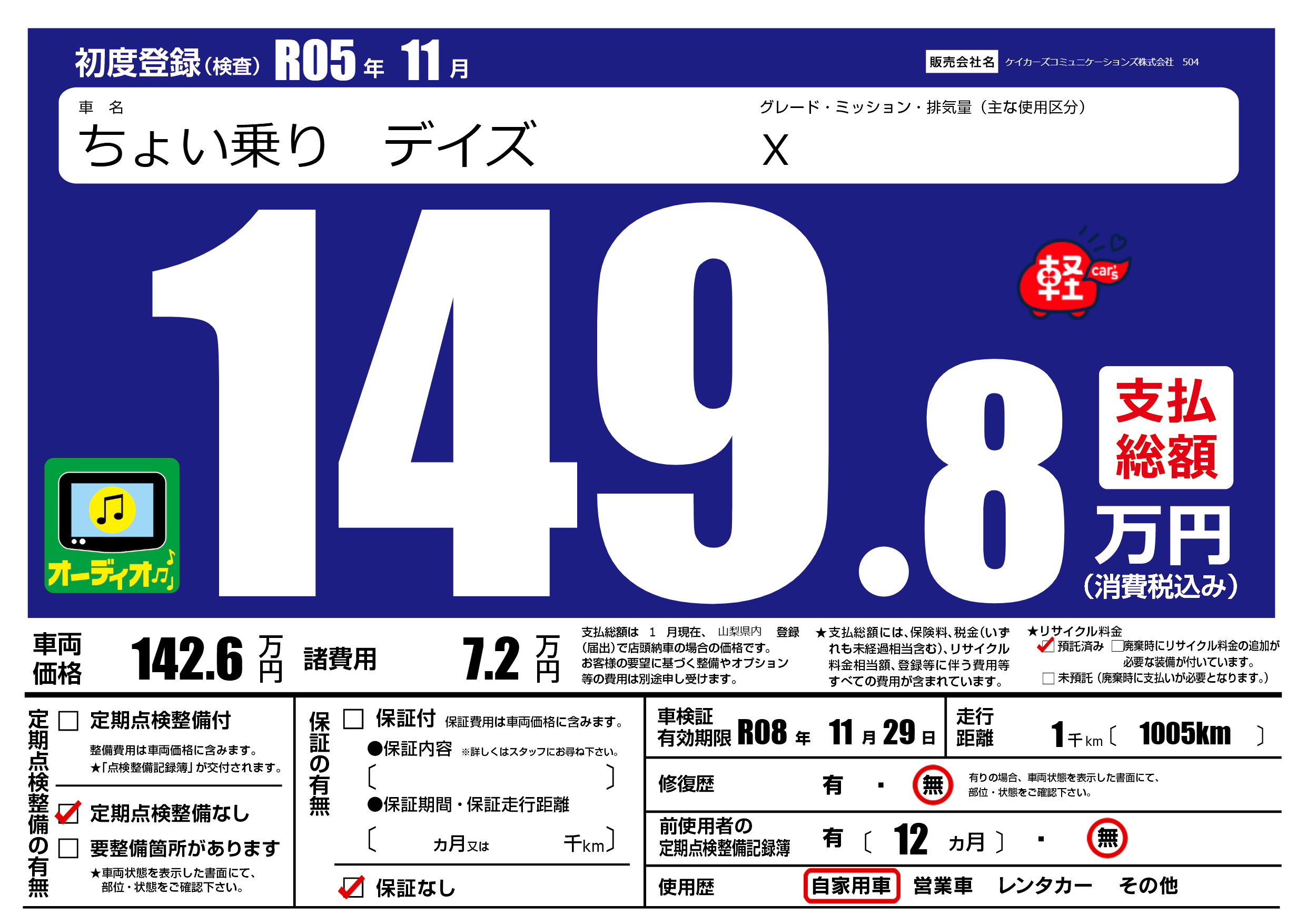 | 走行キロ | 0.1万km | 初年度登録 | R05年11月 |
