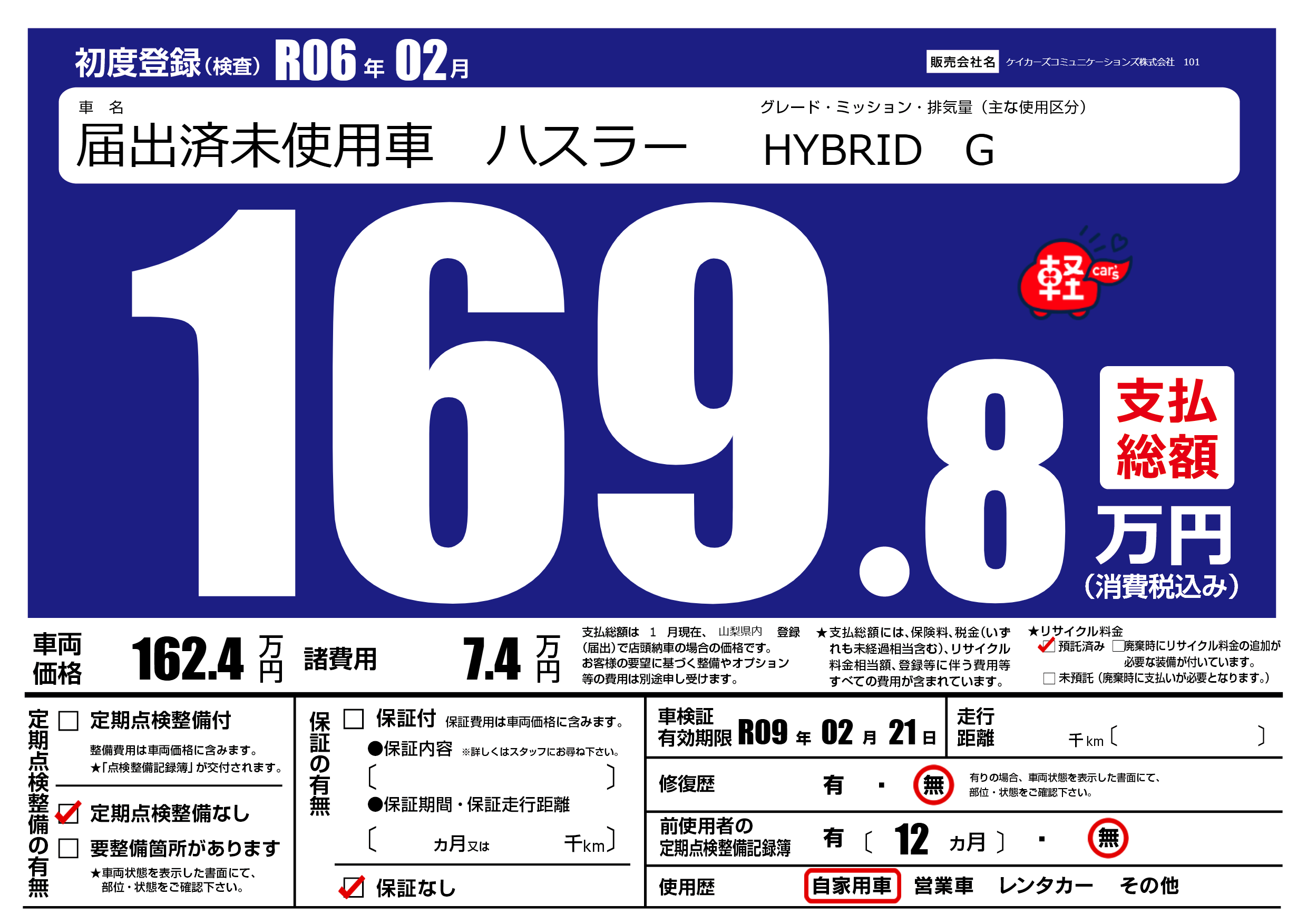 | 車名 | 届出済未使用車 ハスラー | グレード ミッション 排気量 |