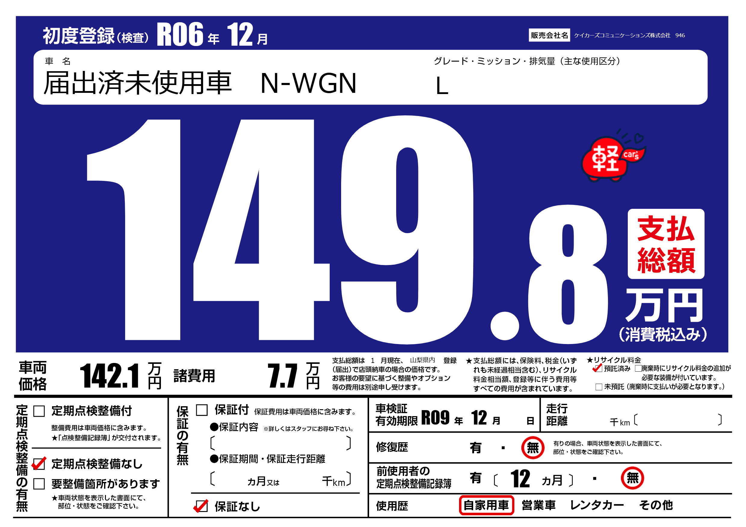 | 走行キロ | - | 初年度登録 | R06年12月 |
