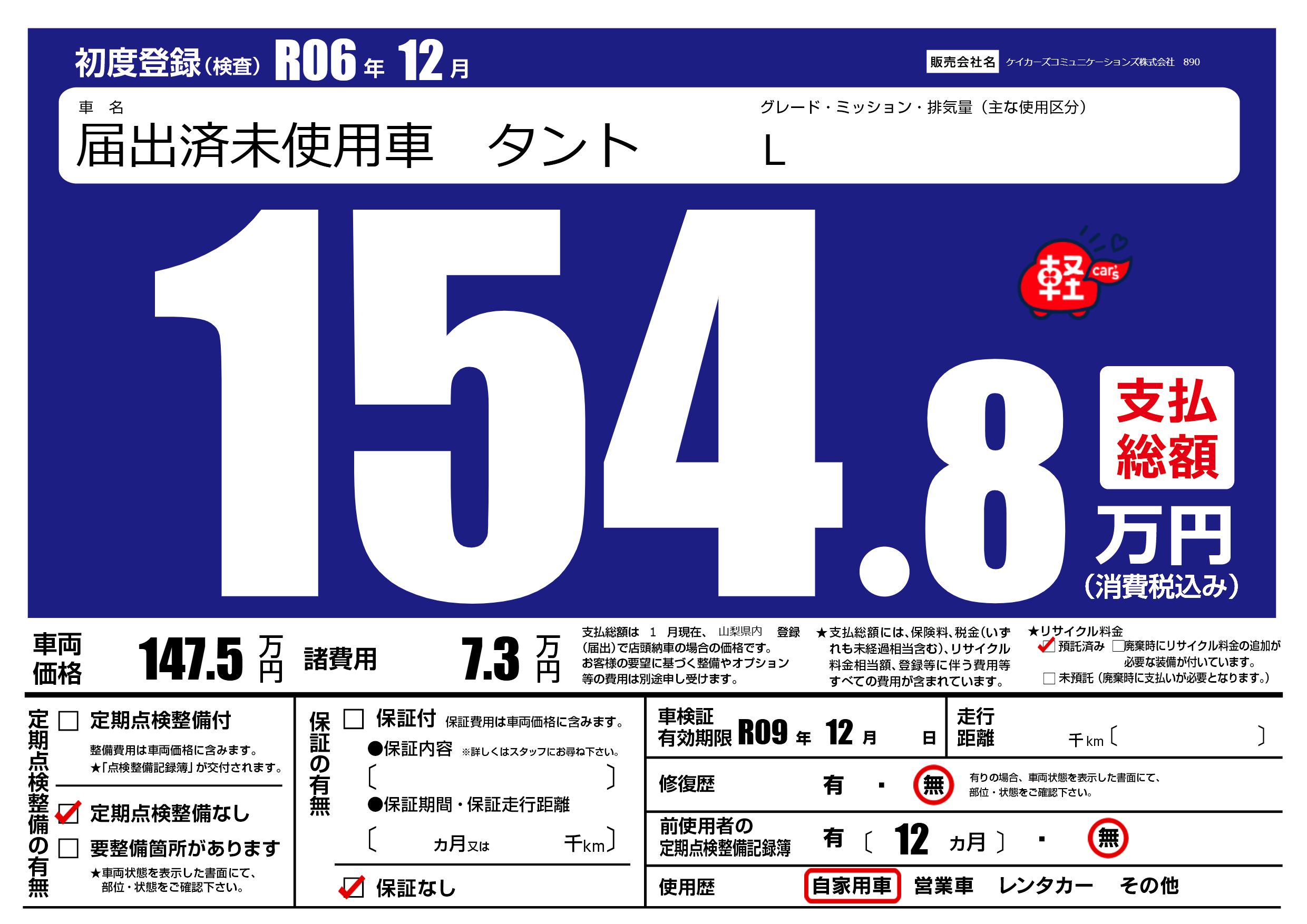 | 車名 | 届出済未使用車 タント | グレード ミッション 排気量 |