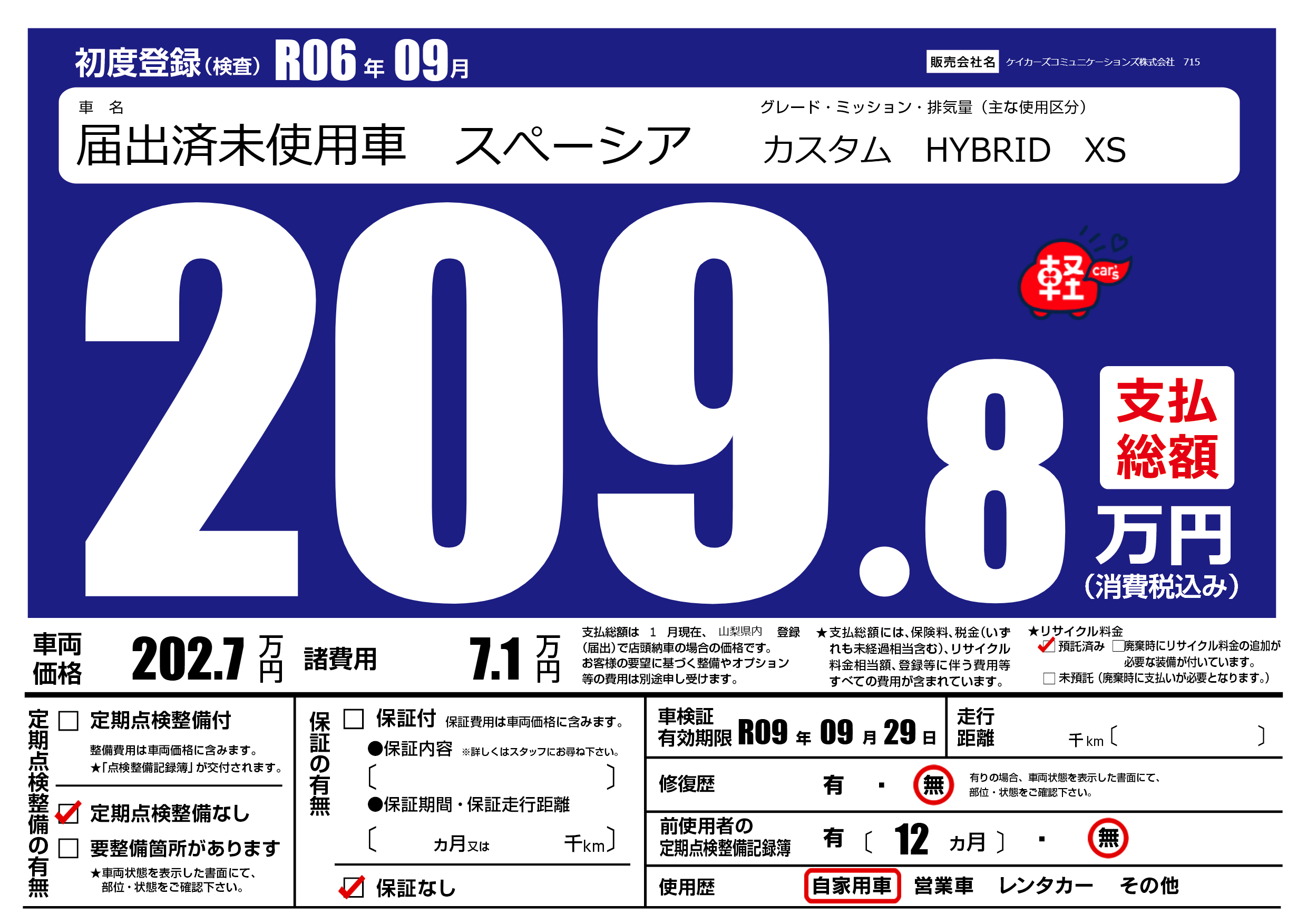 | 走行キロ | - | 初年度登録 | R06年09月 |