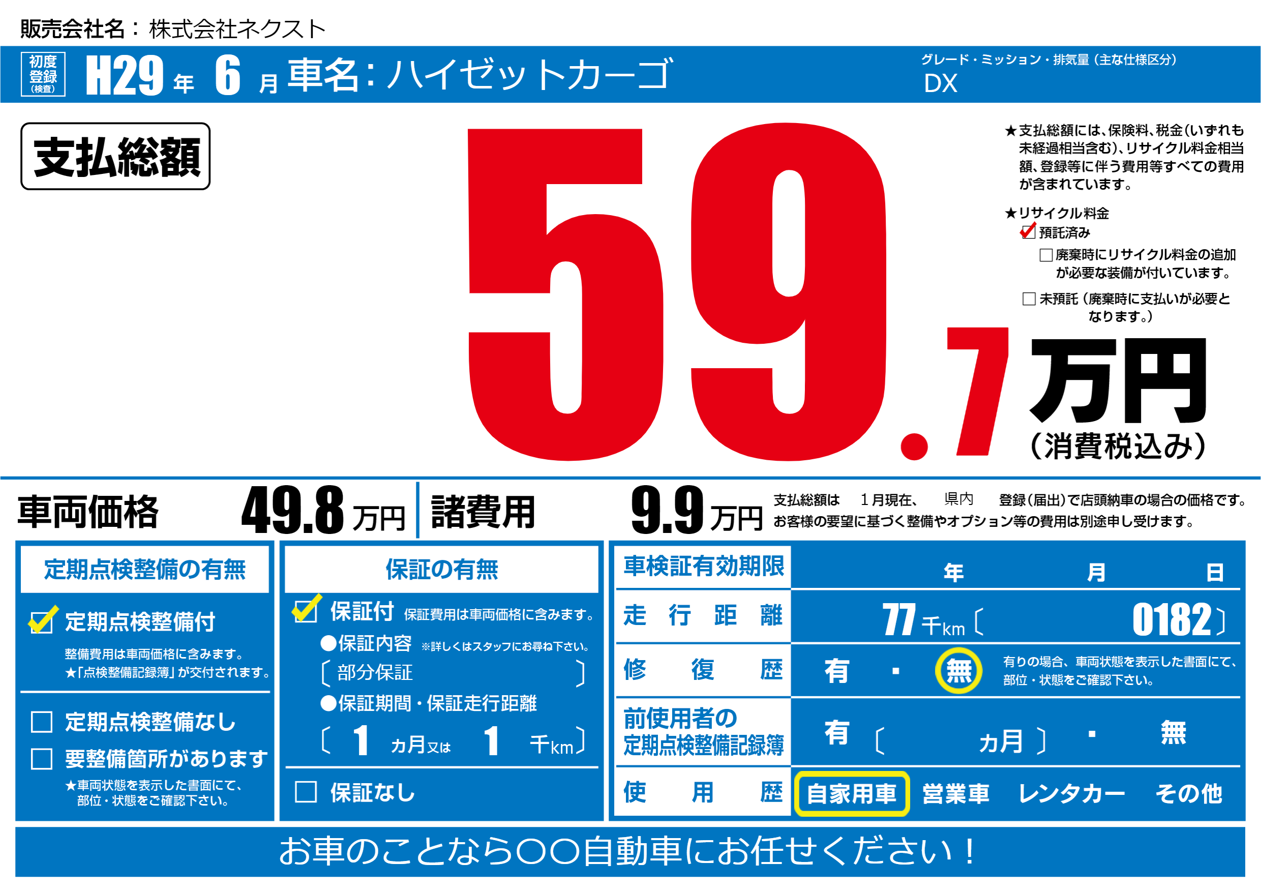 | 車名 | ハイゼットカーゴ | グレード ミッション 排気量 |