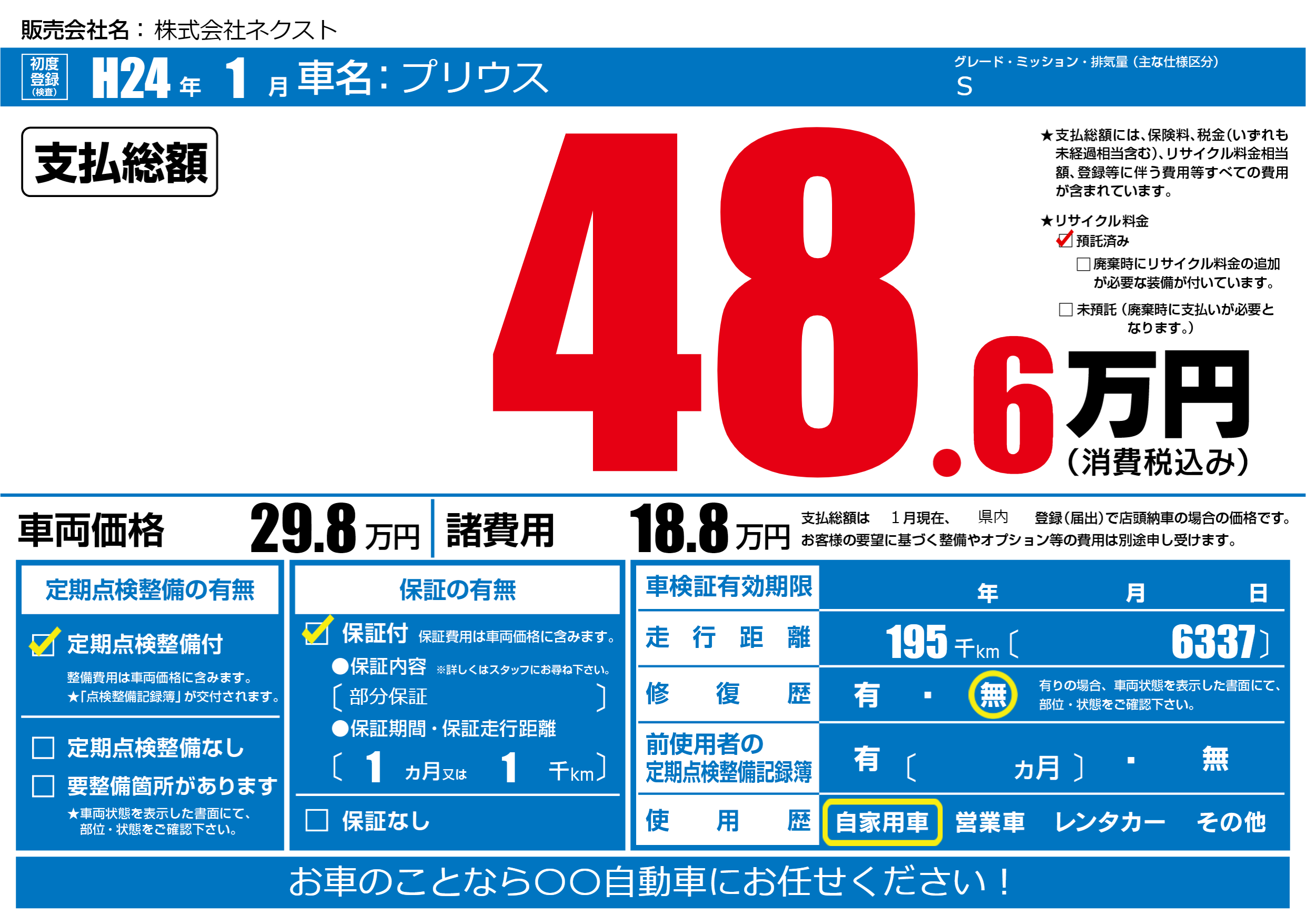 | 車名 | プリウス | グレード ミッション 排気量 |