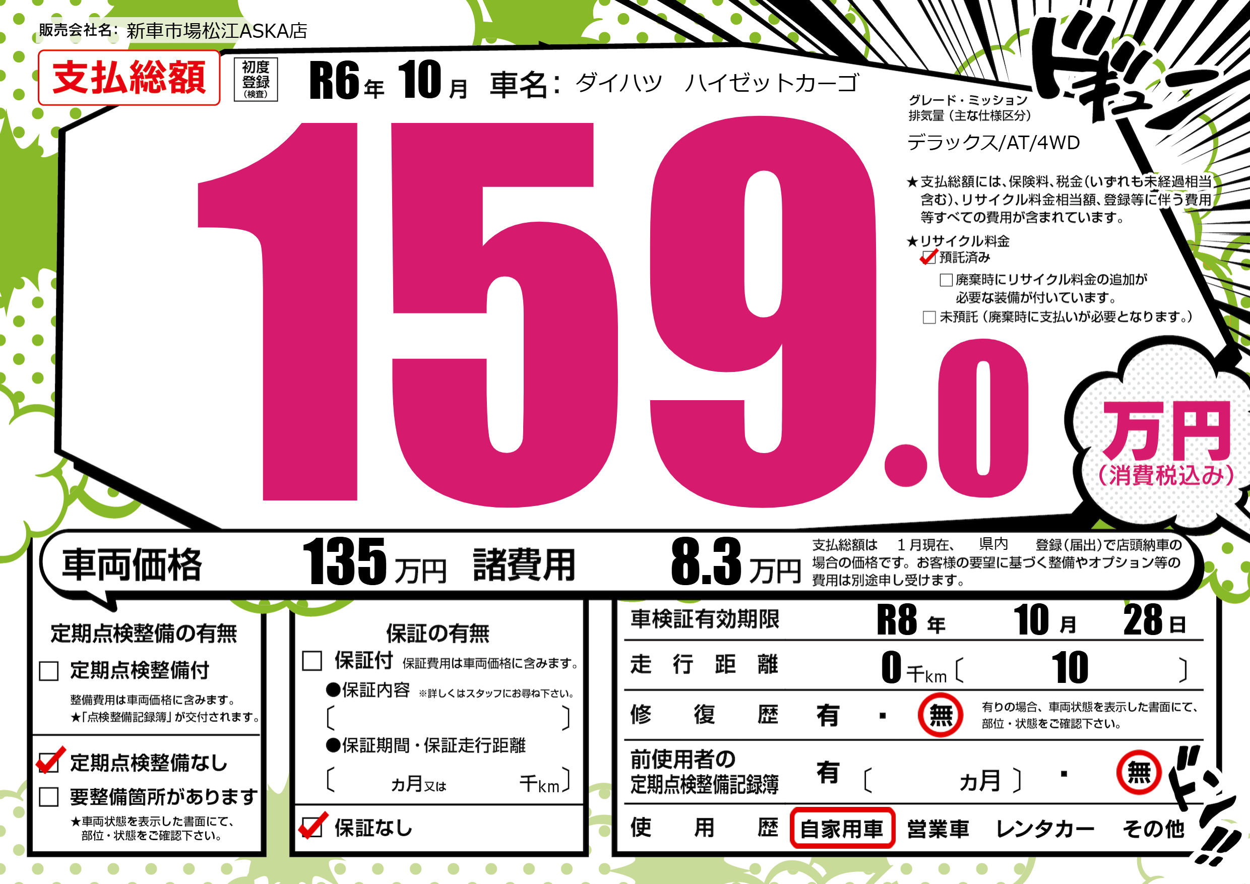 | 車名 | ダイハツ ハイゼットカーゴ | グレード ミッション 排気量 |