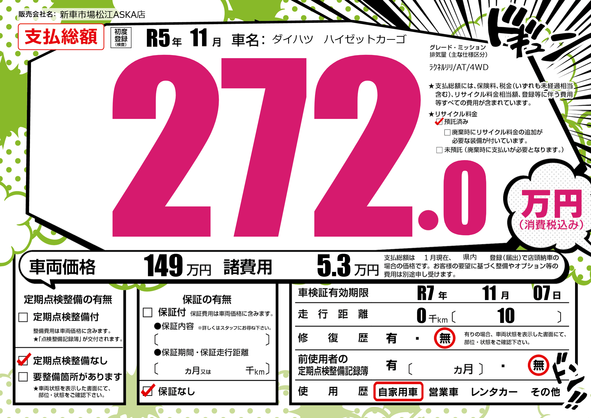 | 車名 | ダイハツ ハイゼットカーゴ | グレード ミッション 排気量 |
