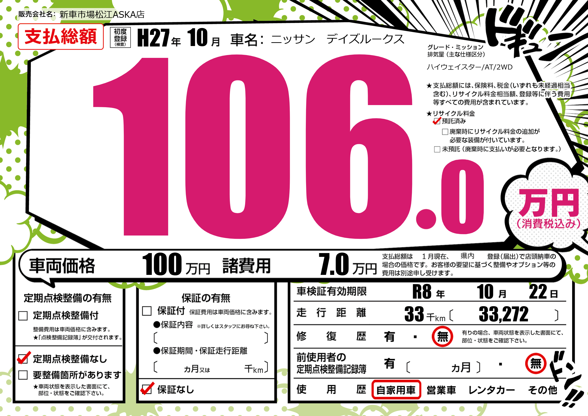| 車名 | ニッサン デイズルークス | グレード ミッション 排気量 |