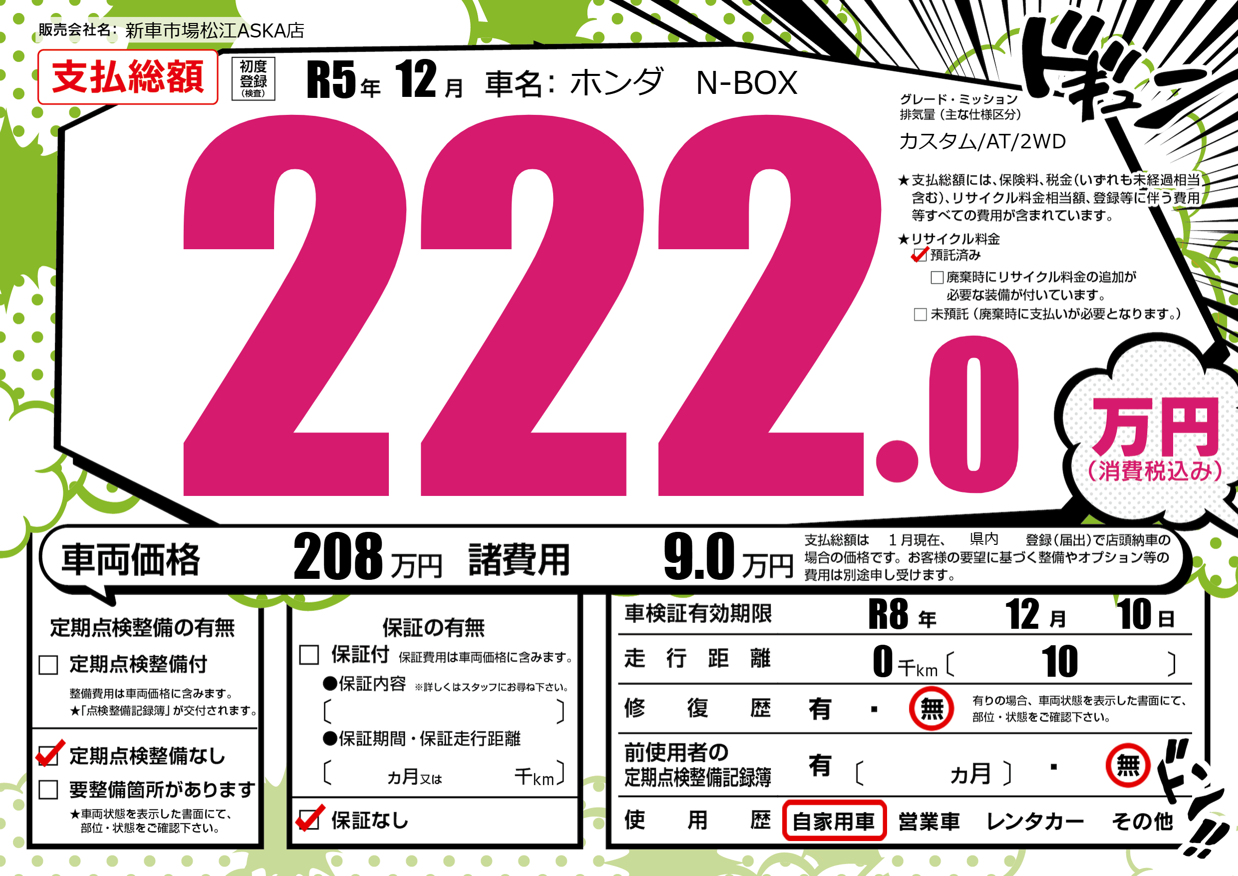 | 車名 | ホンダ N-BOX | グレード ミッション 排気量 |