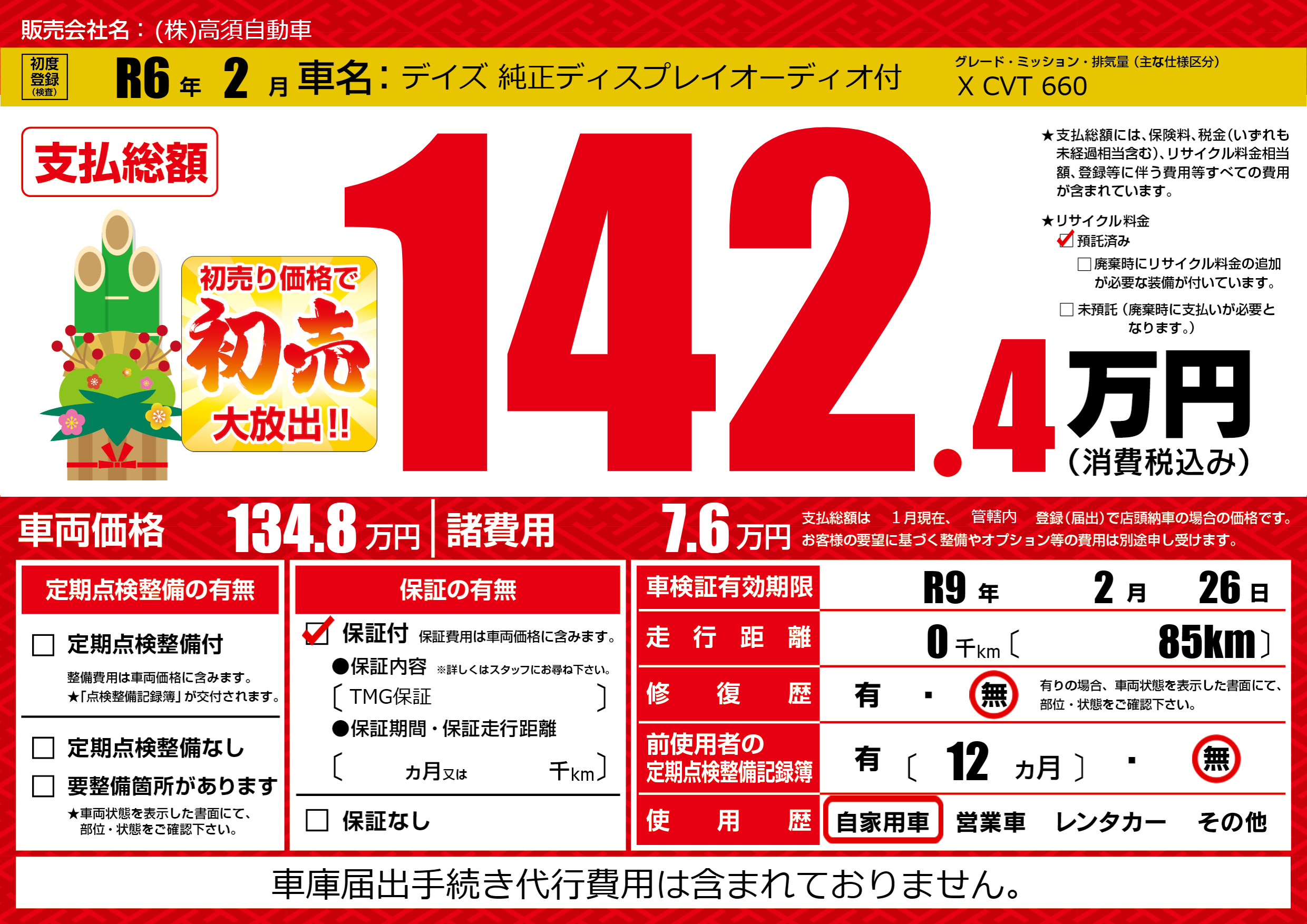 | 車名 | デイズ 純正ディスプレイオーディオ付 | グレード ミッション 排気量 |