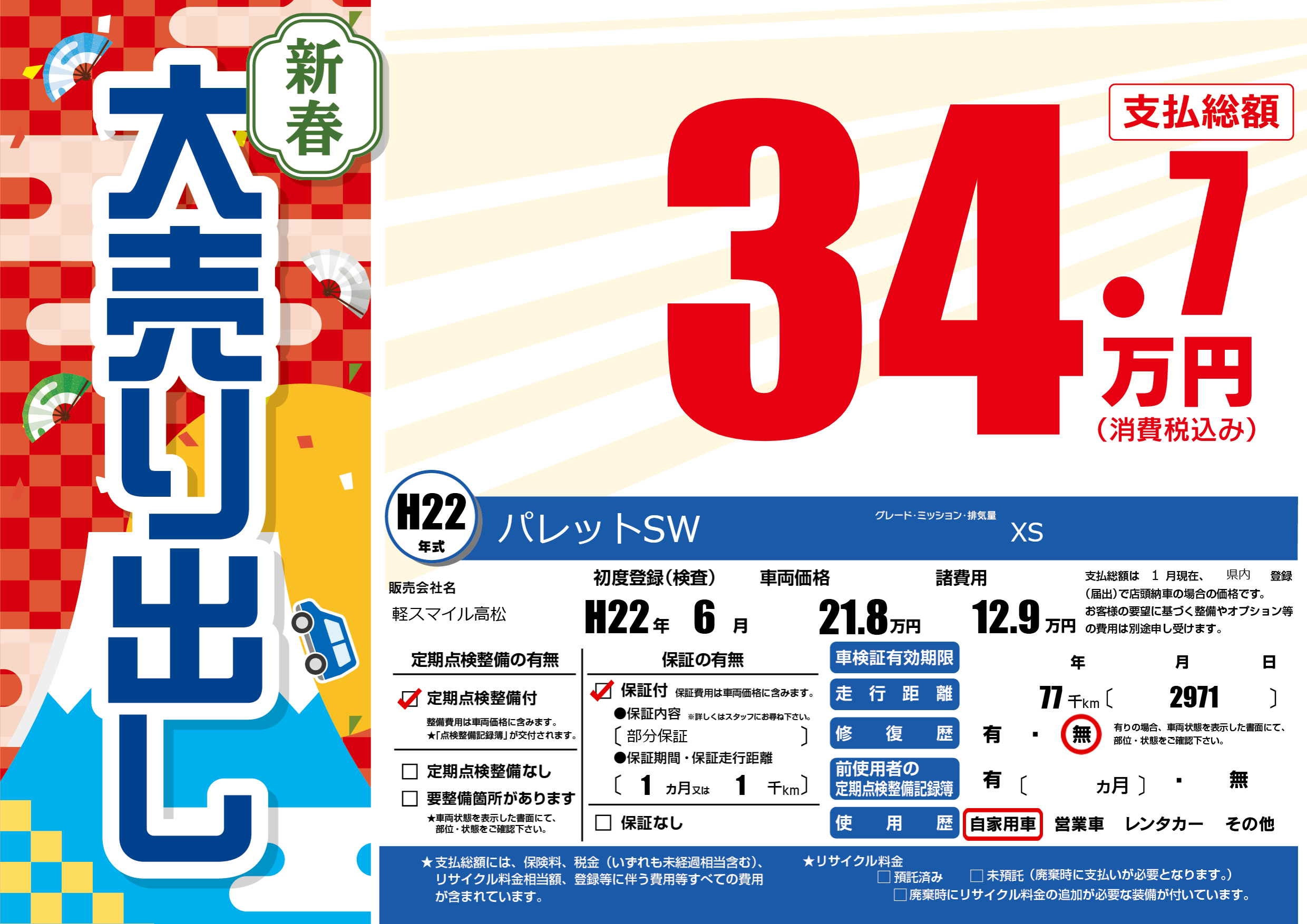 | 走行キロ | 7.7万km | 初年度登録 | H22年6月 |