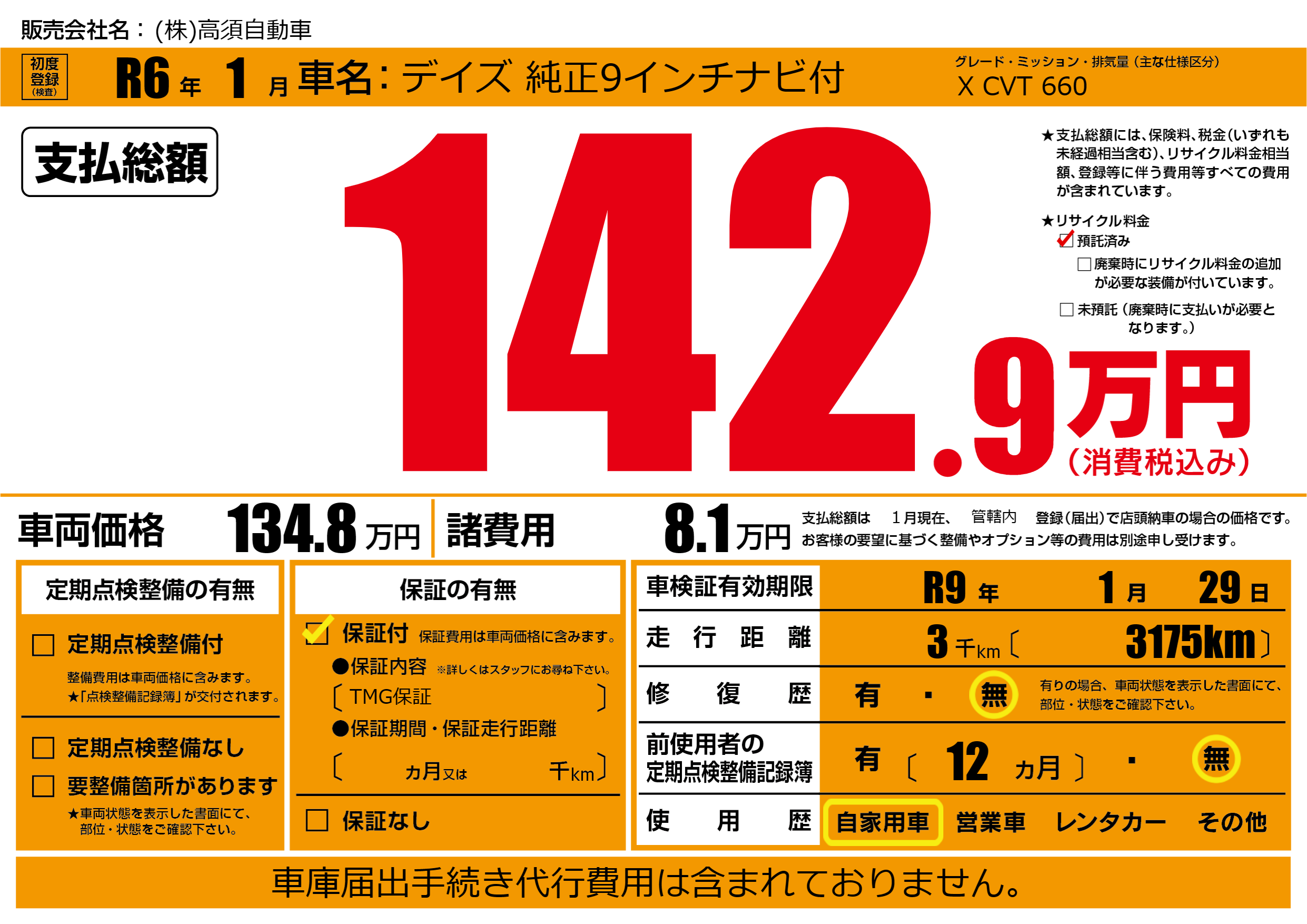 | 車名 | デイズ 純正9インチナビ付 | グレード ミッション 排気量 |