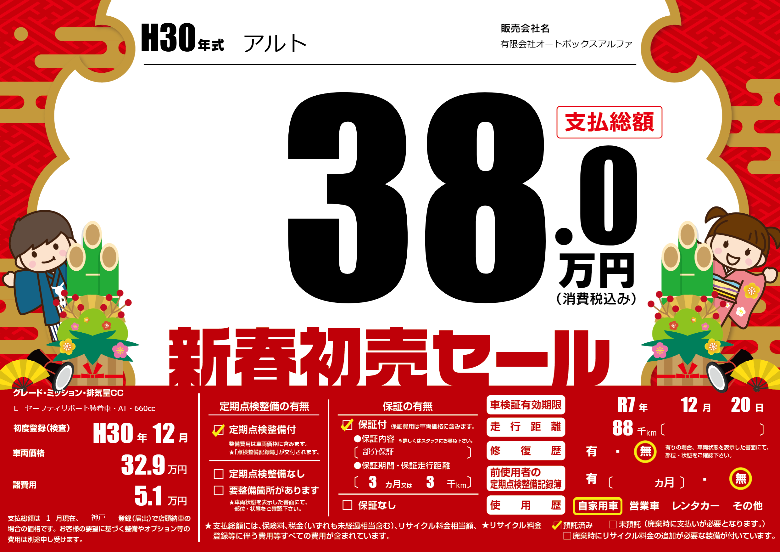 保証付き 保証内容(部分保証) 3ヶ月または(3)千kmまで |