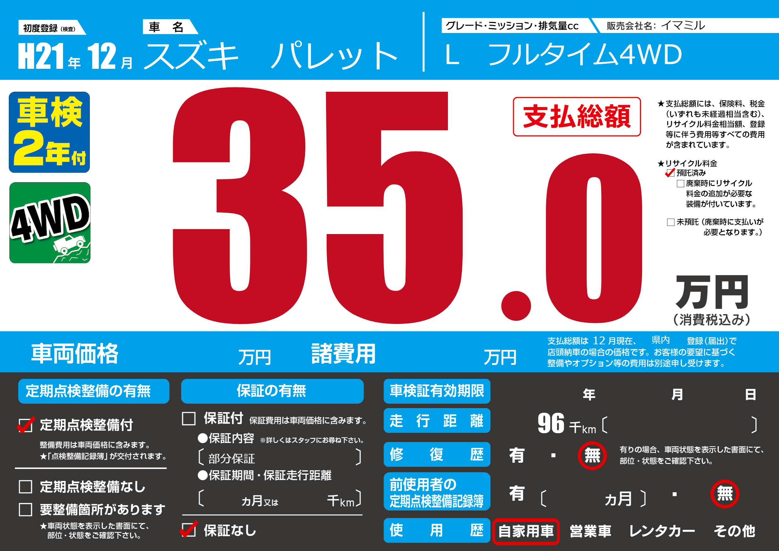 | 走行キロ | 9.6万km | 初年度登録 | H21年12月 |