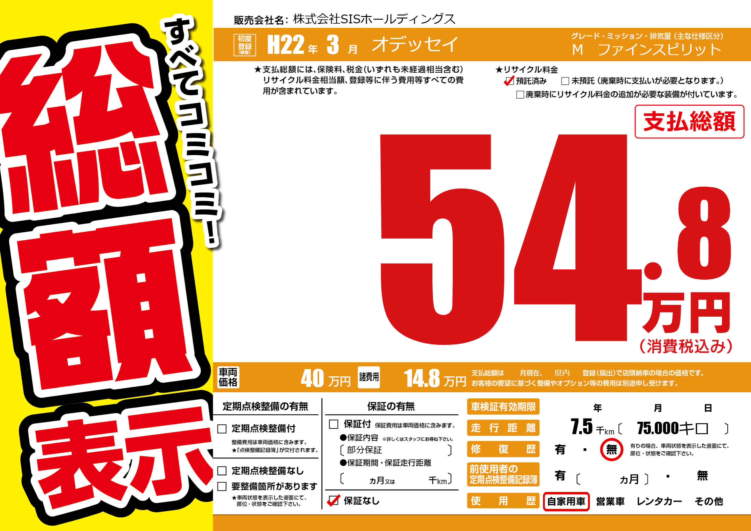 | 車名 | オデッセイ | グレード ミッション 排気量 |