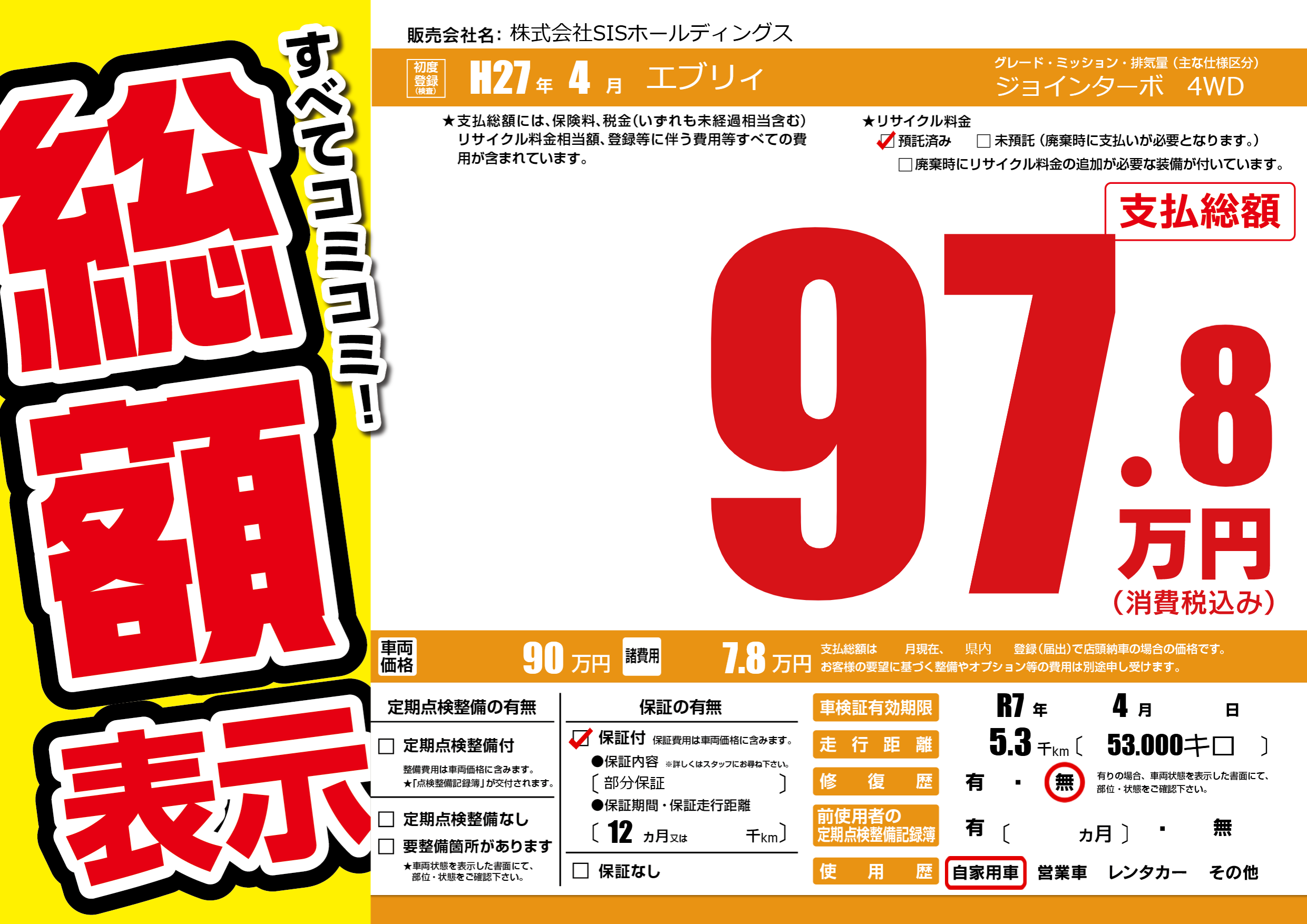 | 車名 | エブリィ | グレード ミッション 排気量 |