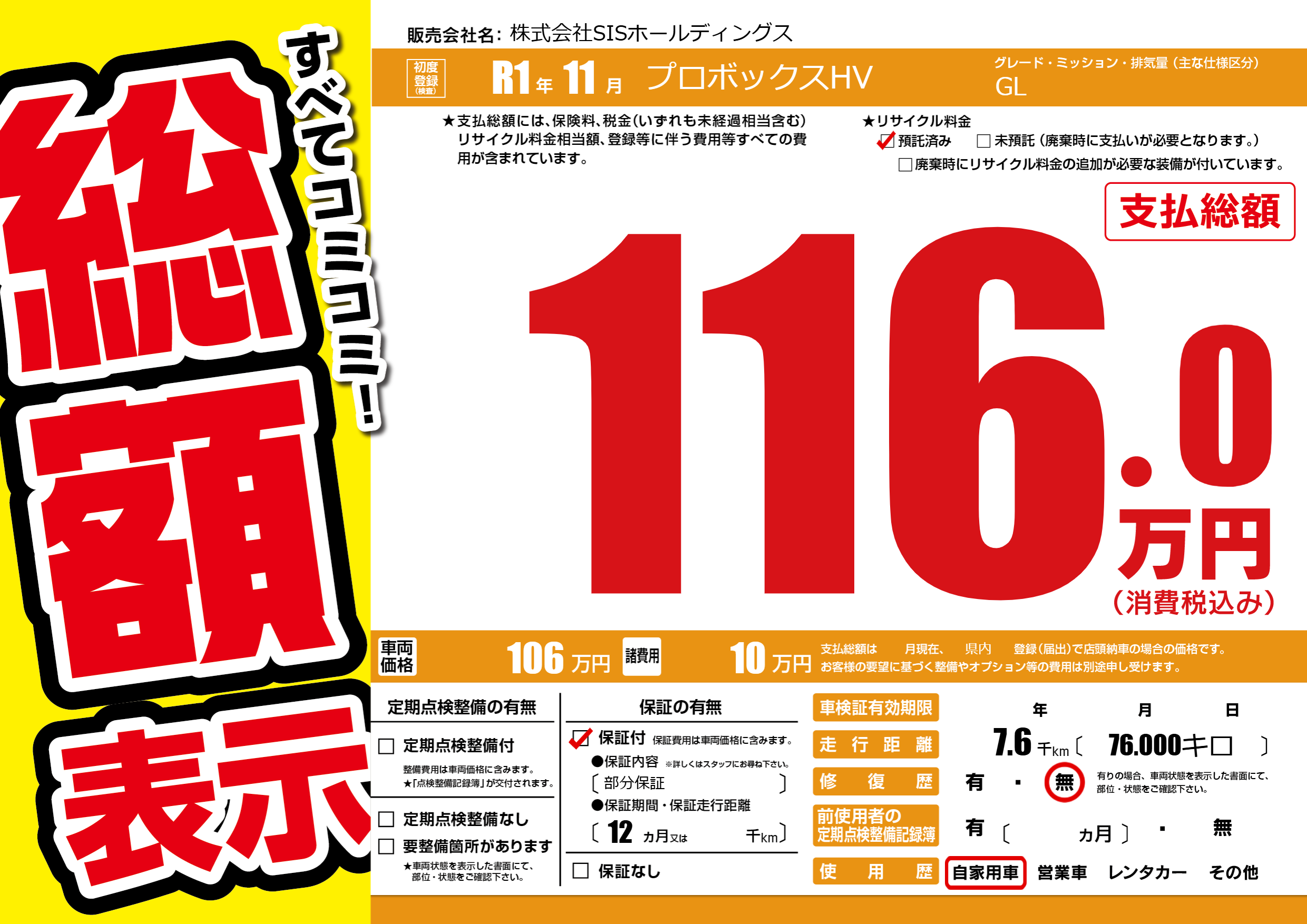 | 車名 | プロボックスHV | グレード ミッション 排気量 |