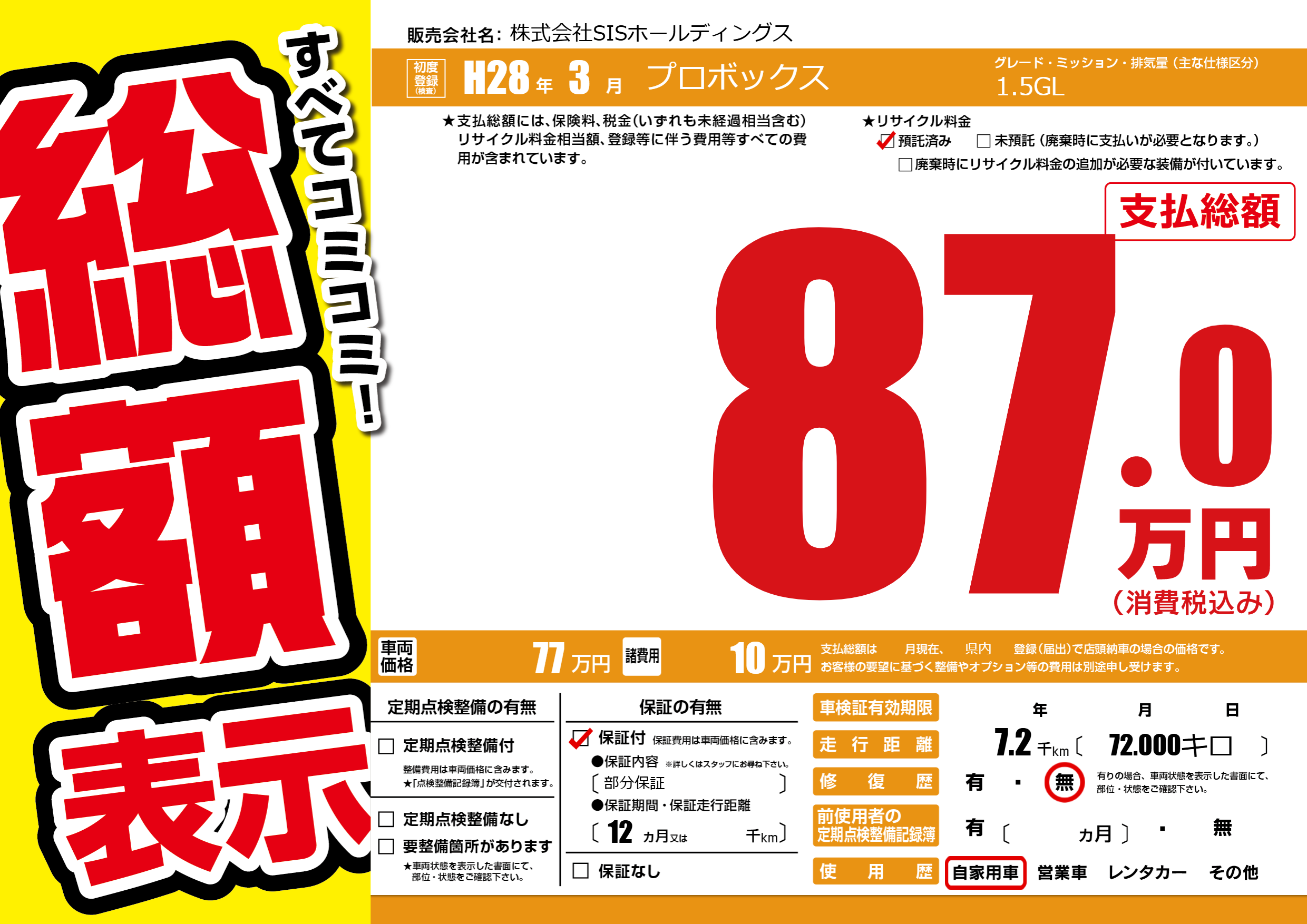| 車名 | プロボックス | グレード ミッション 排気量 |