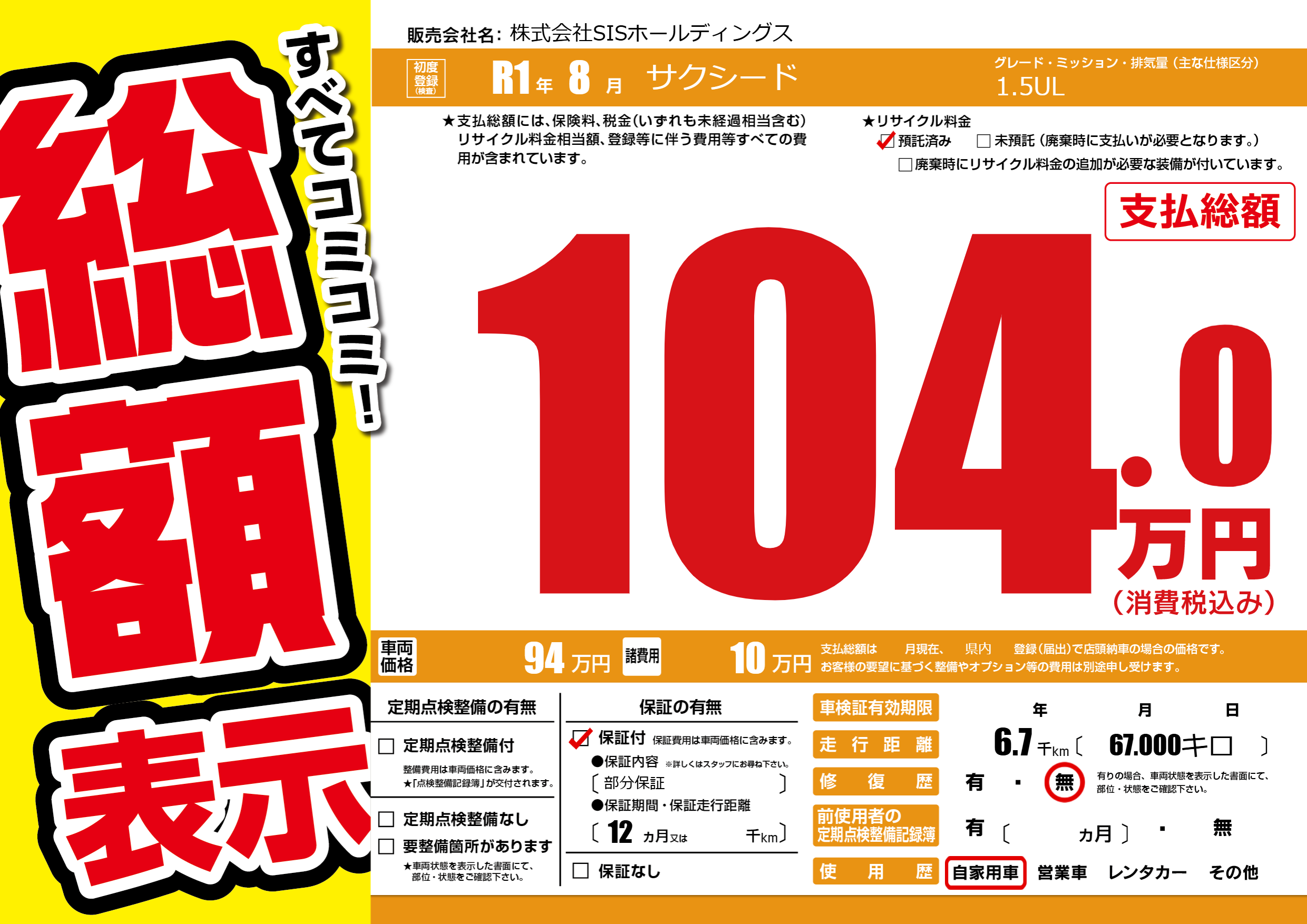 | 車名 | サクシード | グレード ミッション 排気量 |