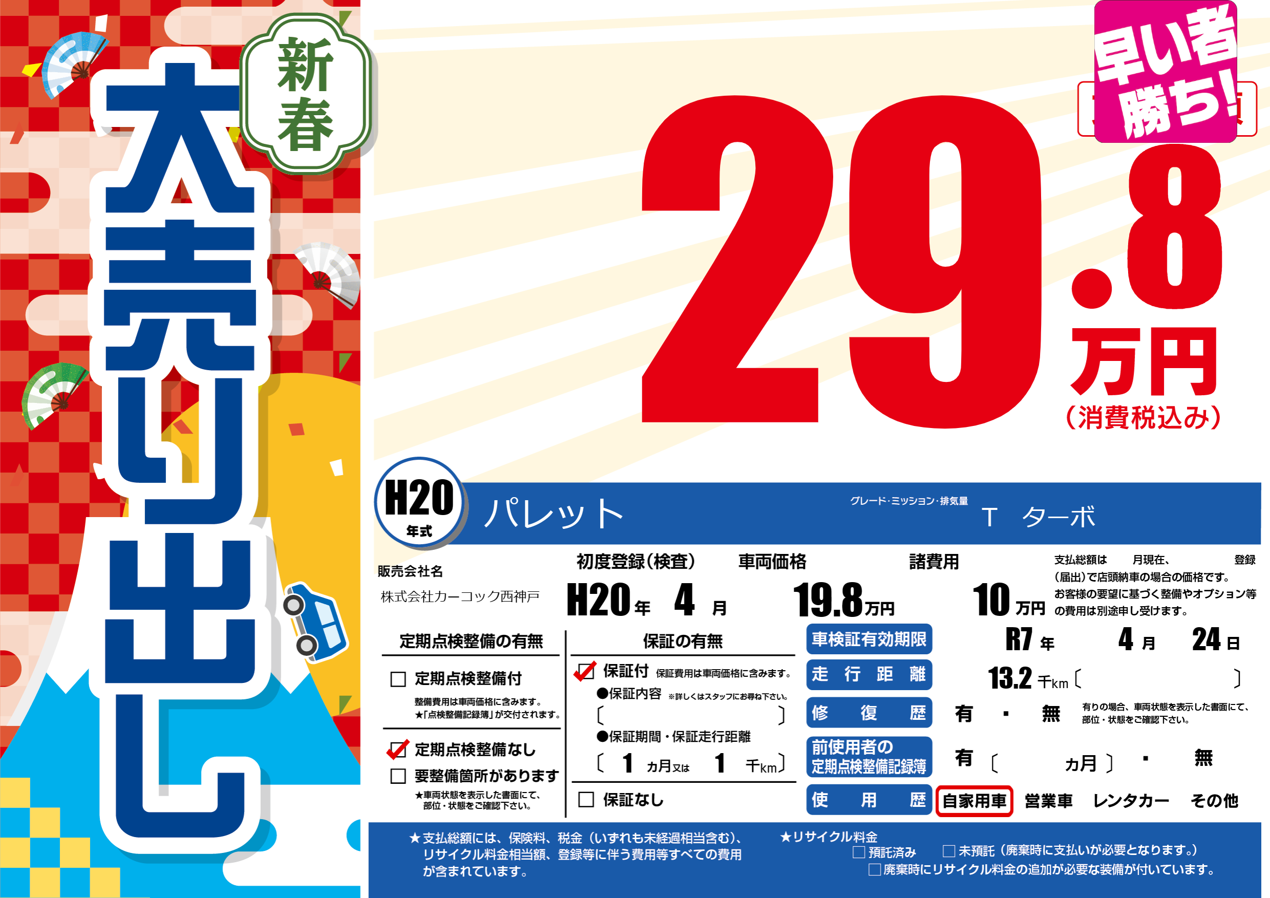 | 走行キロ | 1.3万km | 初年度登録 | H20年4月 |