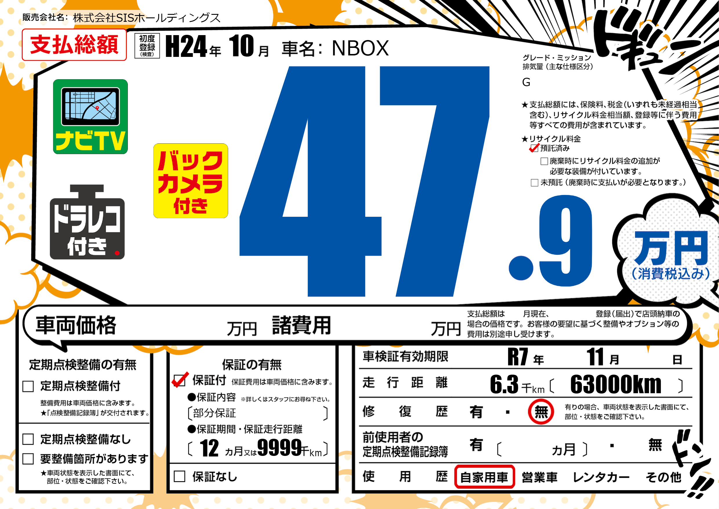 | 車名 | NBOX | グレード ミッション 排気量 |