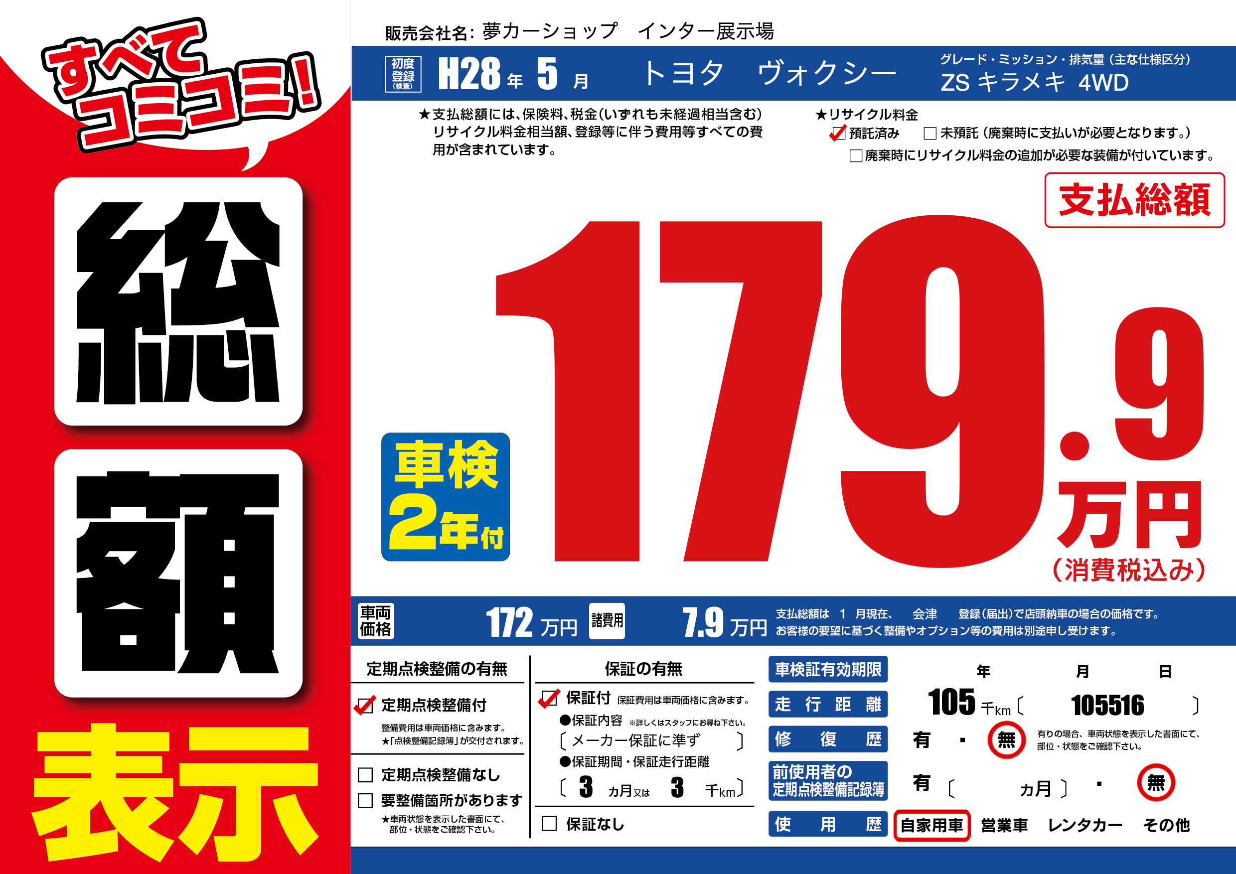 | 車名 | トヨタ ヴォクシー | グレード ミッション 排気量 |