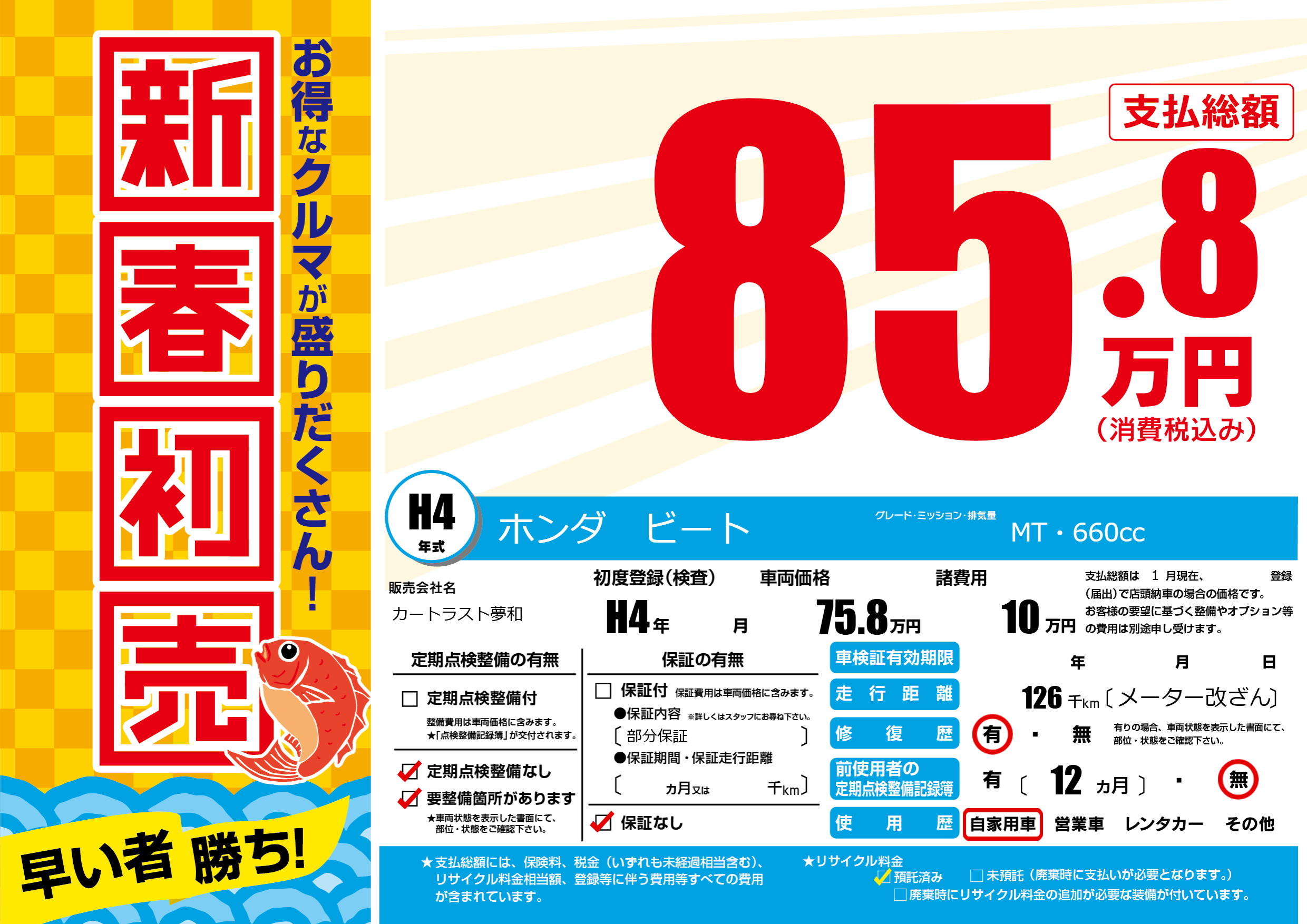 | 走行キロ | 12.6万km | 初年度登録 | H4年---月 |
