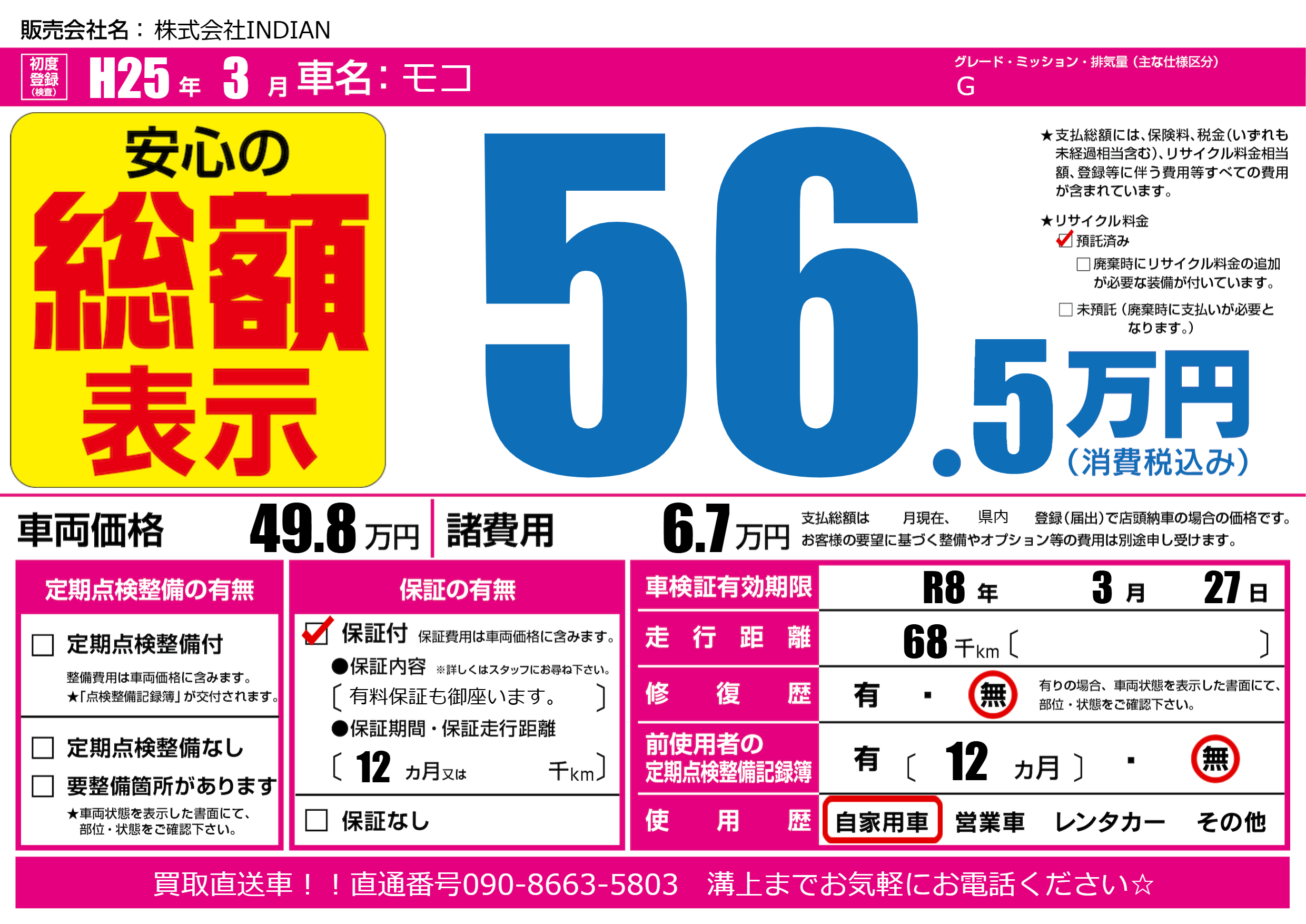 | 走行キロ | 6.8万km | 初年度登録 | H25年3月 |