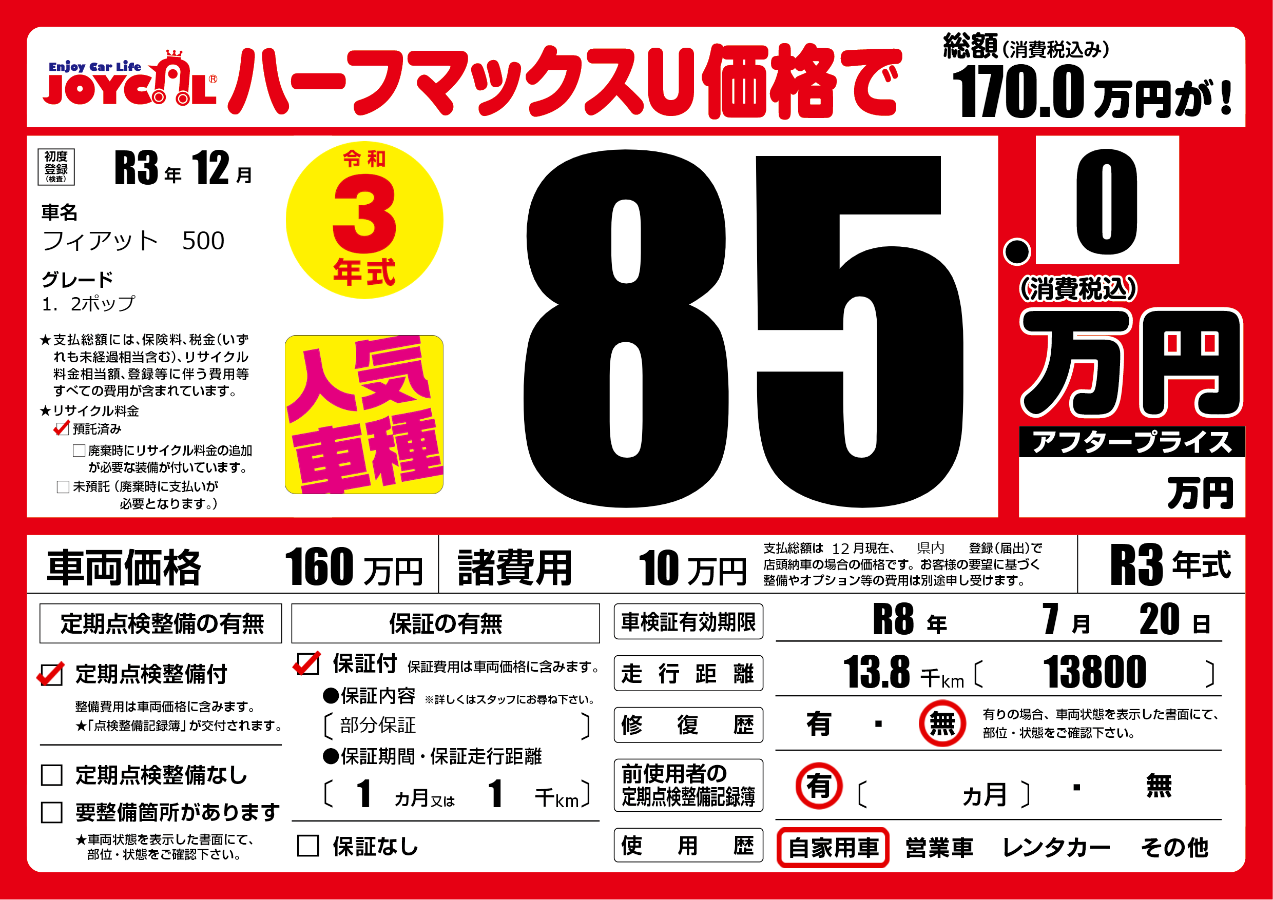 | 車名 | フィアット 500 | グレード ミッション 排気量 |