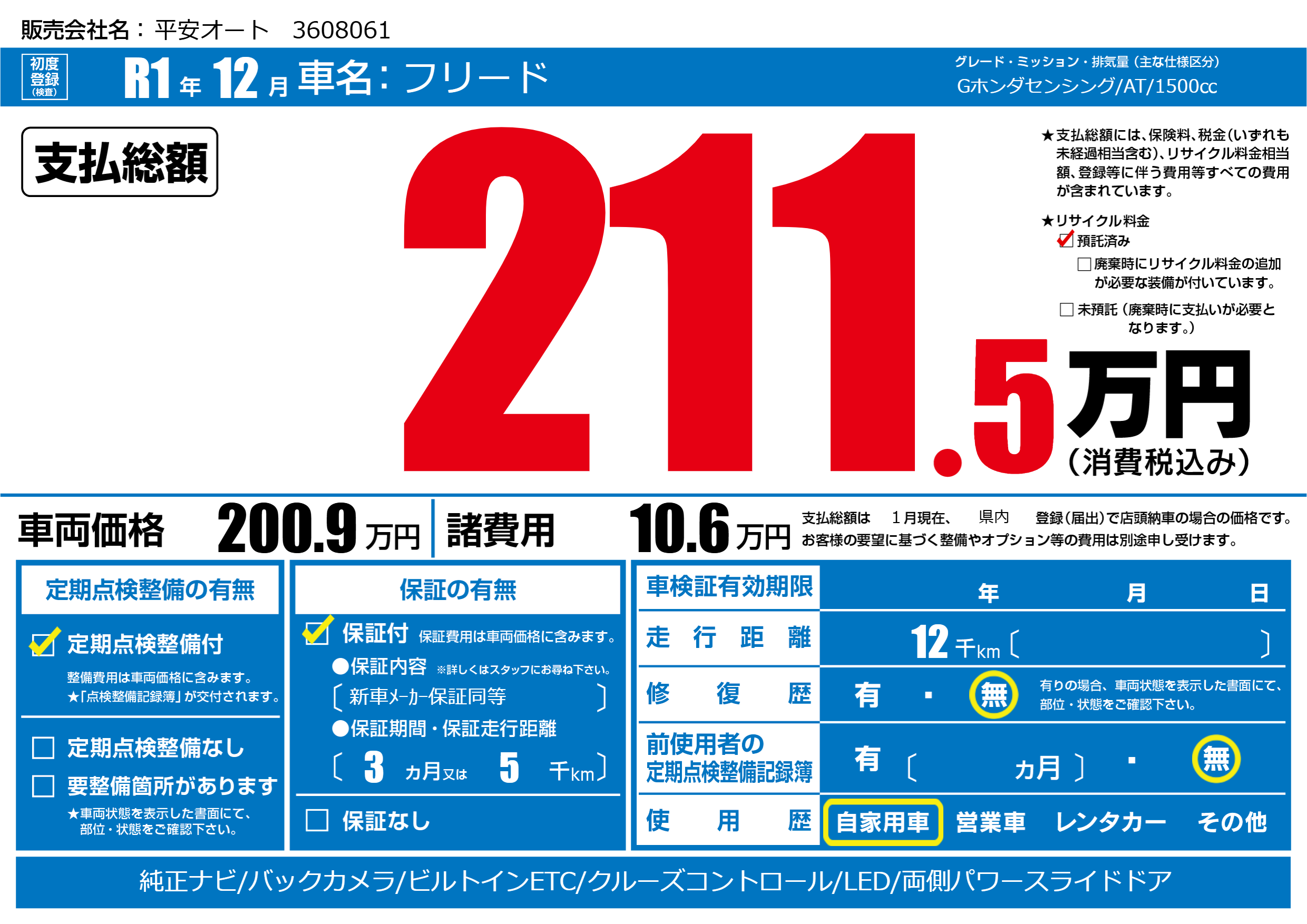 | 走行キロ | 1.2万km | 初年度登録 | R1年12月 |