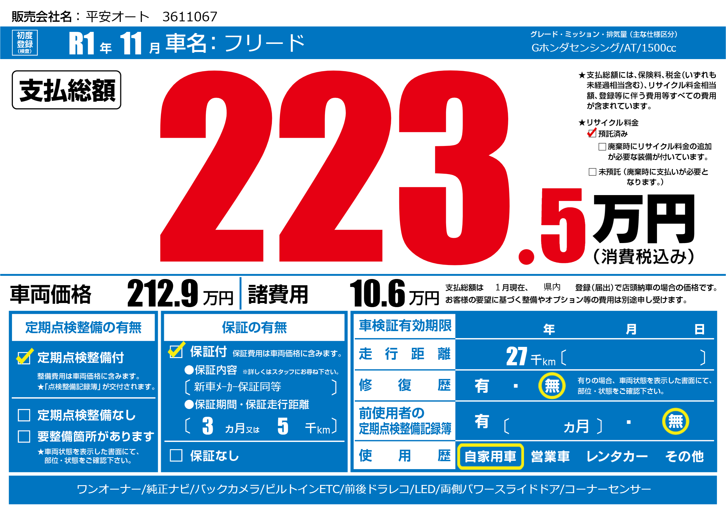 | 走行キロ | 2.7万km | 初年度登録 | R1年11月 |
