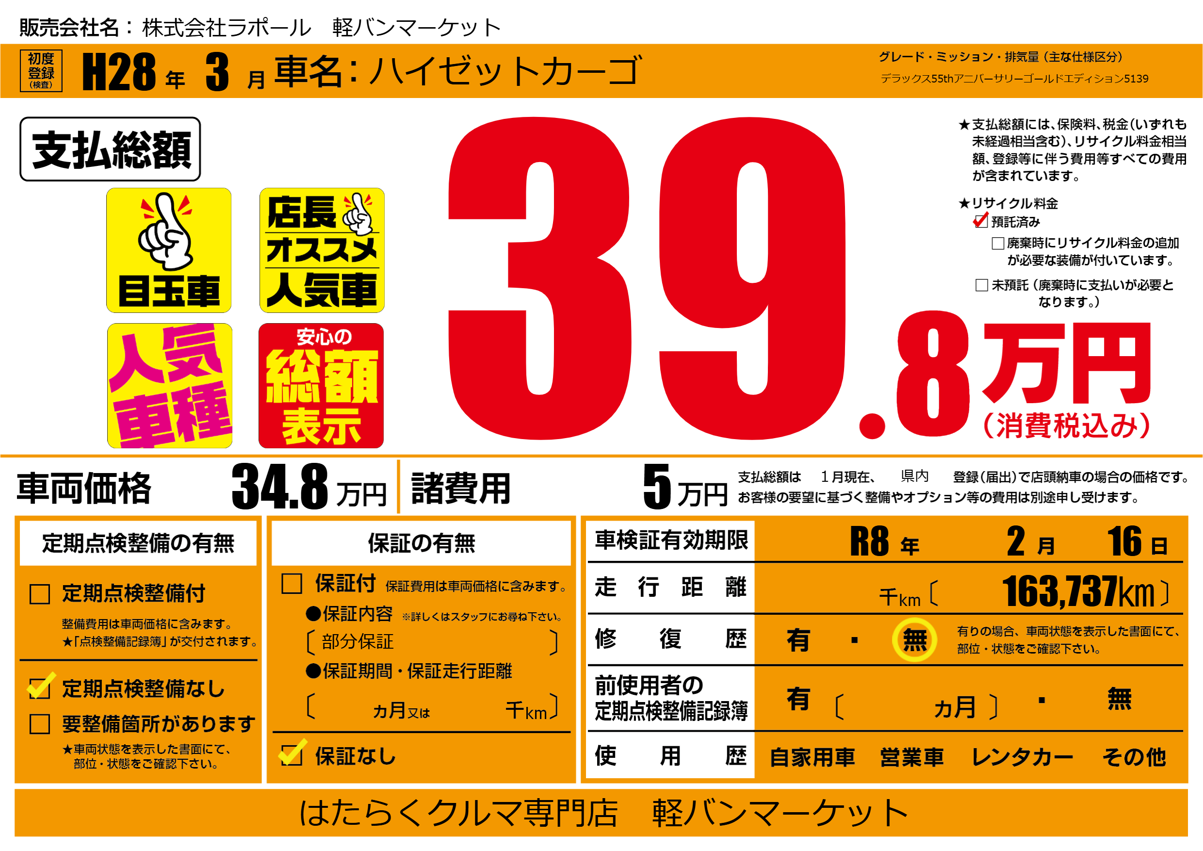 | 車検制限 | R8年 2月 16日 | ||