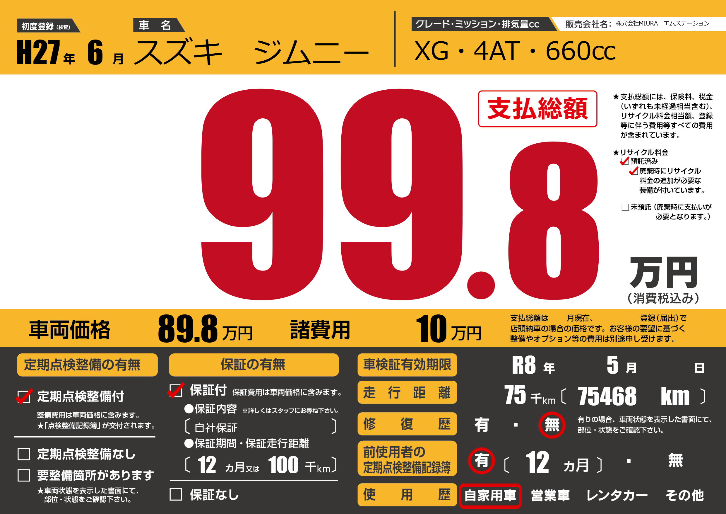 保証付き 保証内容(自社保証) 12ヶ月または(100)千kmまで |