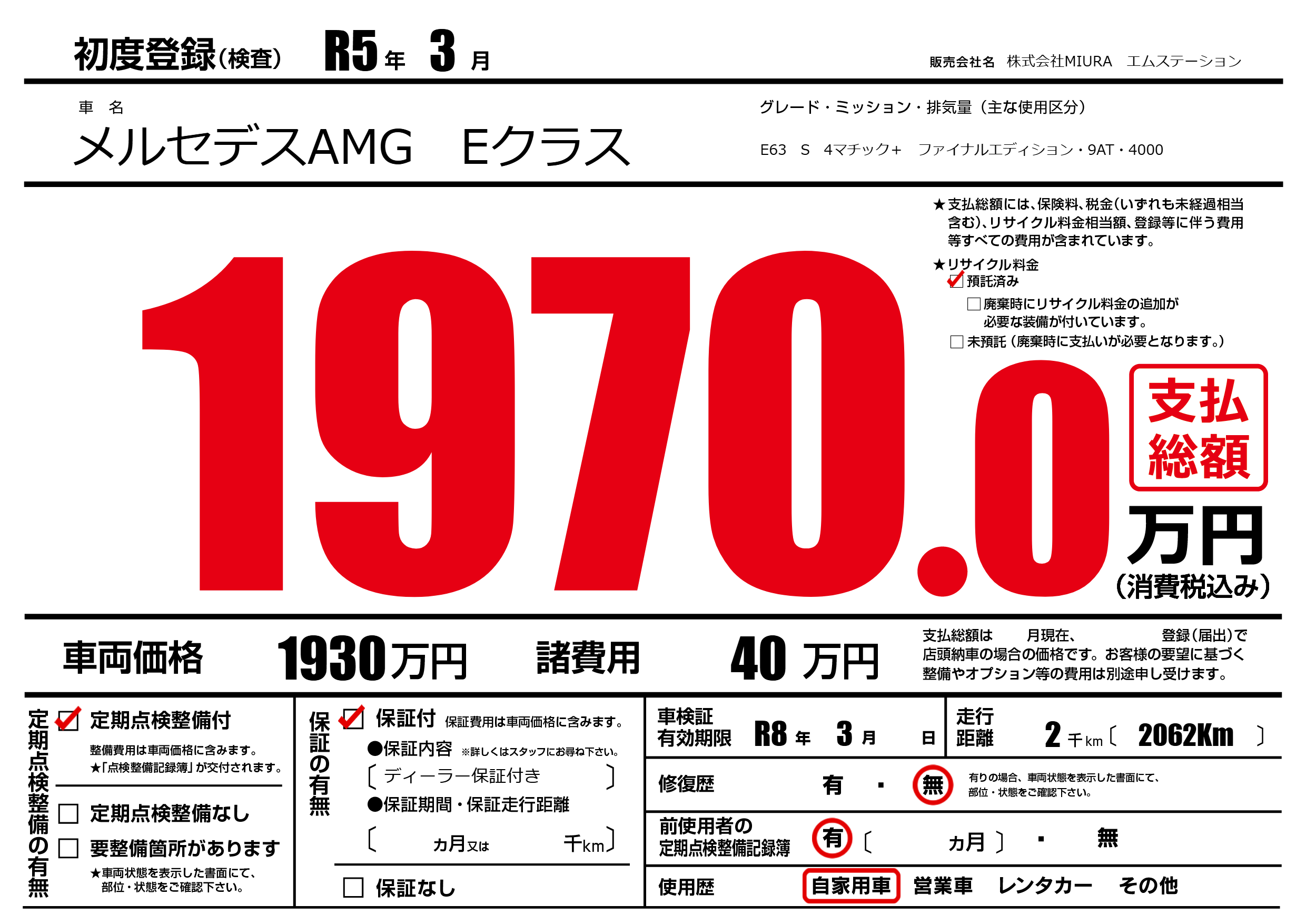 | 車名 | メルセデスAMG Eクラス | グレード ミッション 排気量 |