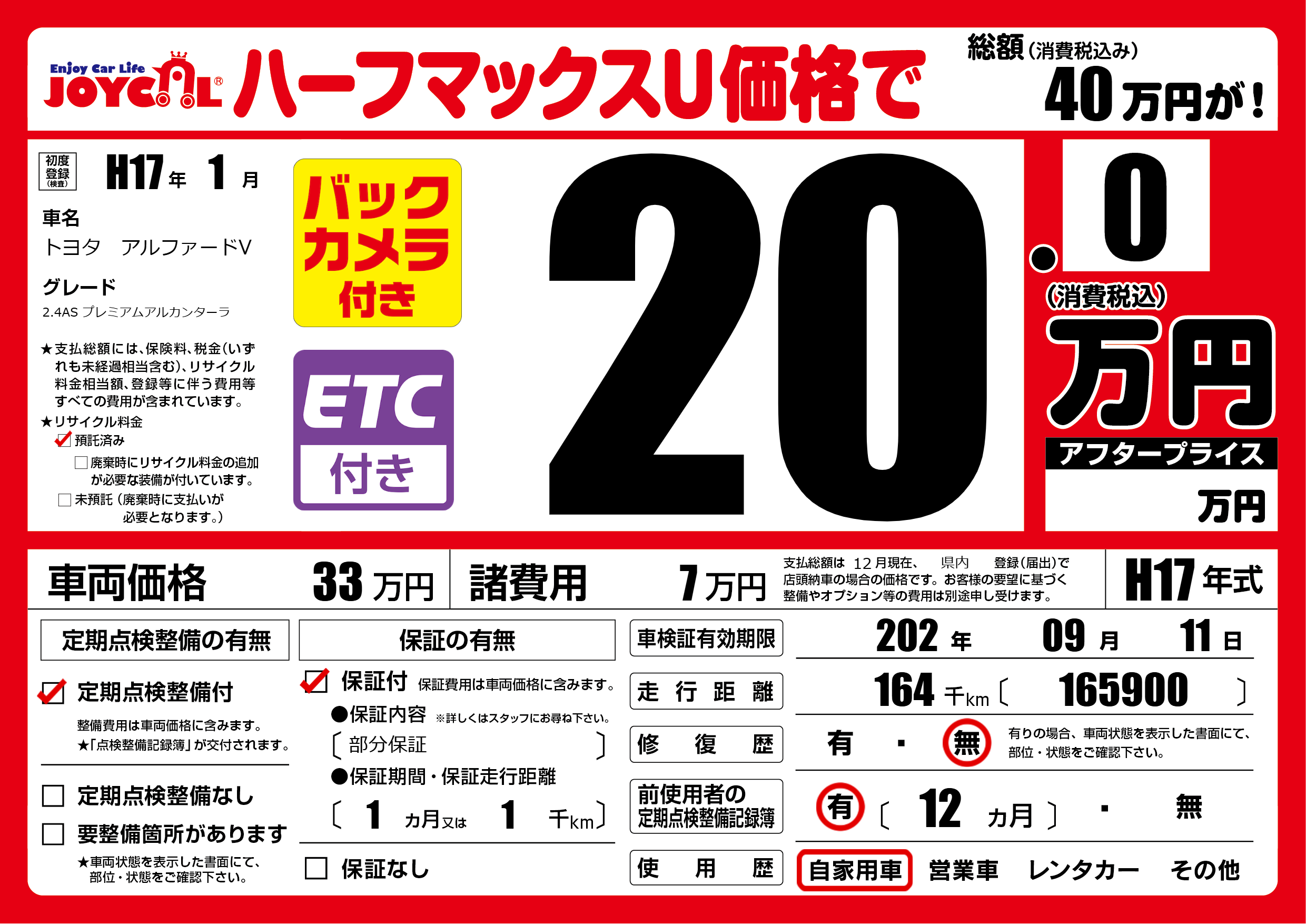 | 走行キロ | 16.4万km | 初年度登録 | H17年1月 |