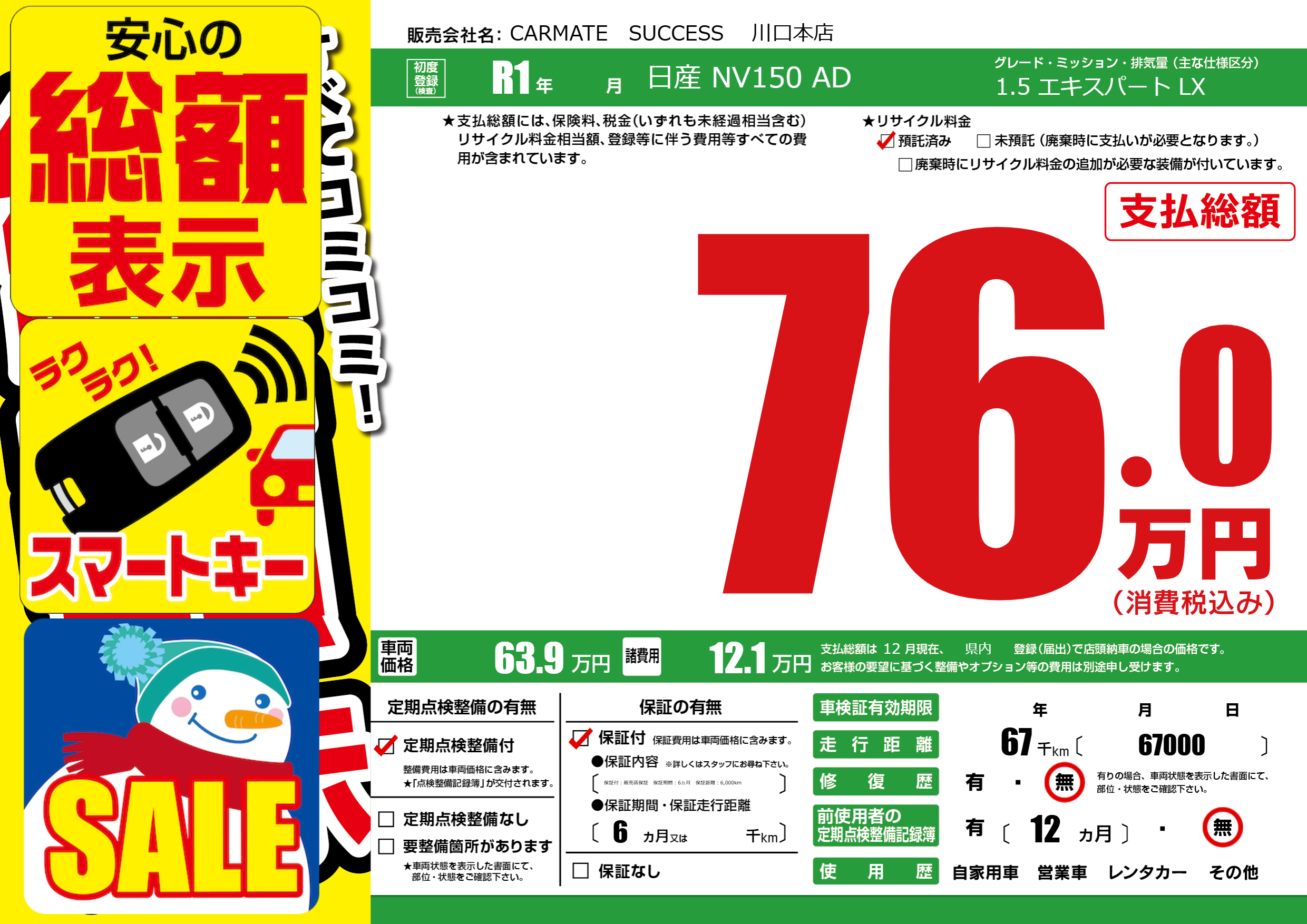 保証内容(保証付:販売店保証 保証期間:6ヵ月 保証距離:6,000km) 6ヶ月または千km