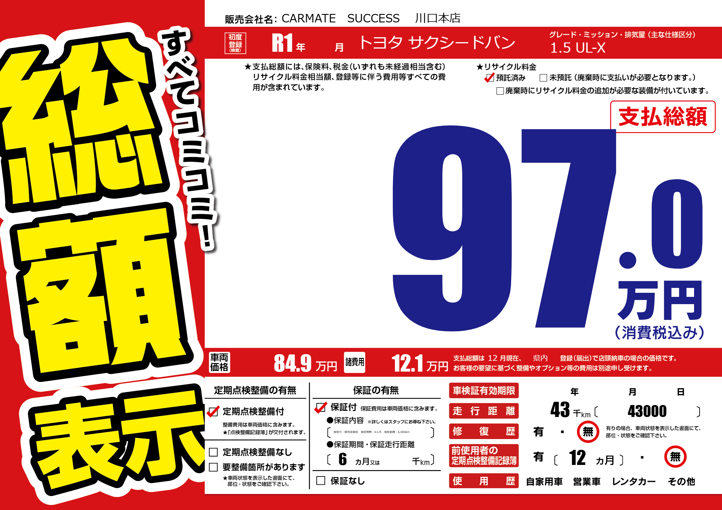 | 車名 | トヨタ サクシードバン | グレード ミッション 排気量 |