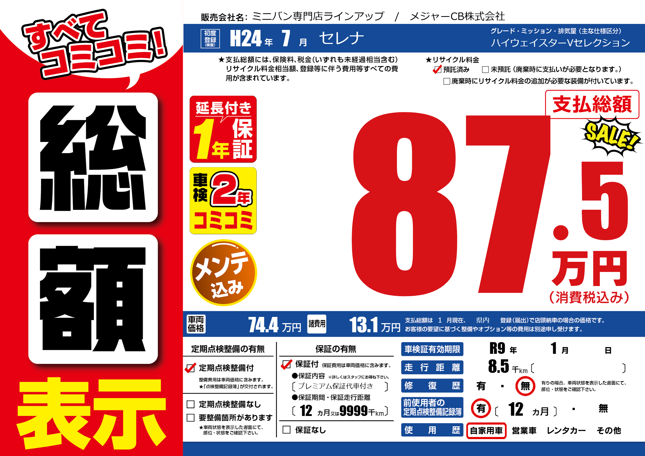 | 車検制限 | R9年 1月 - 日 | ||