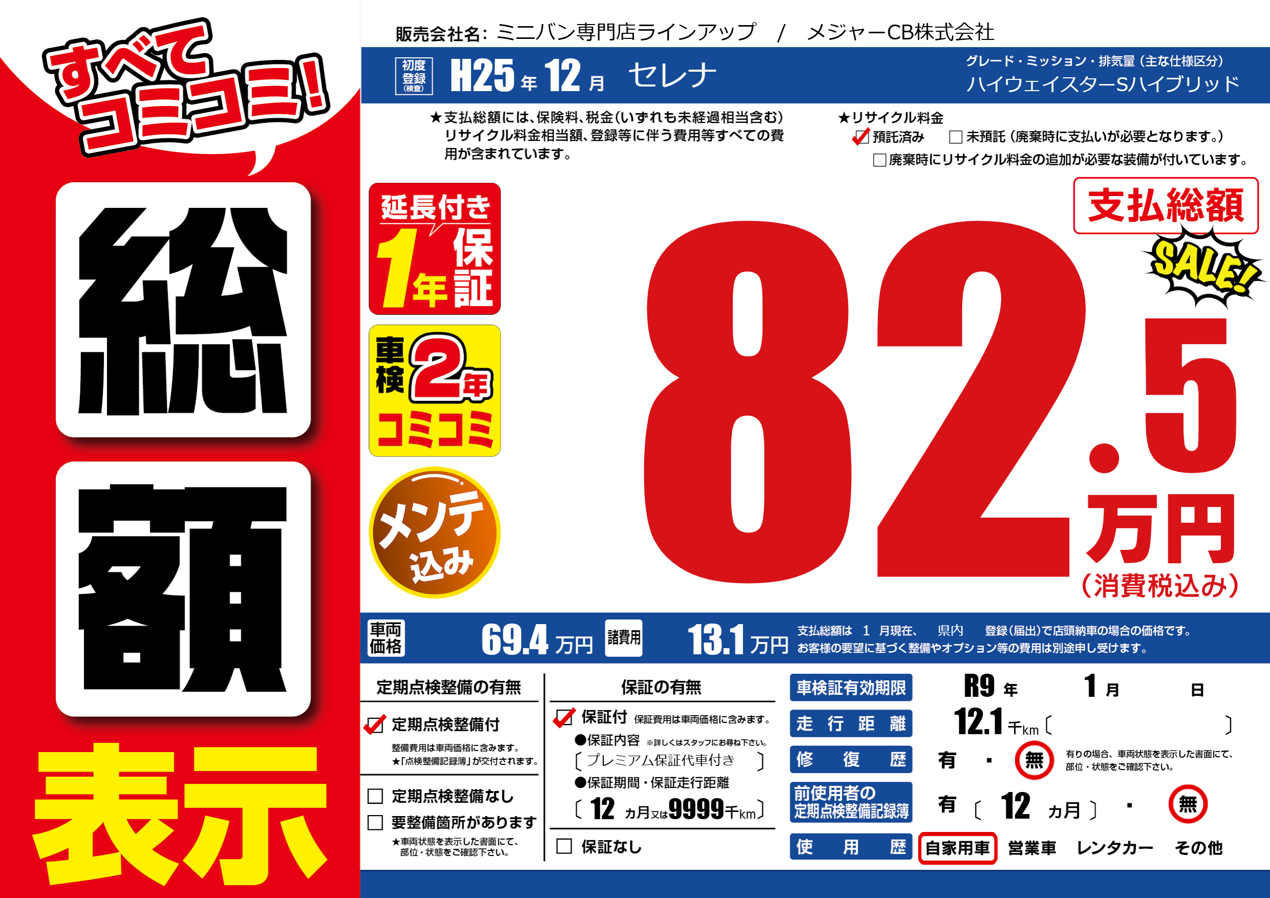 保証付き 保証内容(プレミアム保証代車付き) 12ヶ月または(9999)千kmまで |