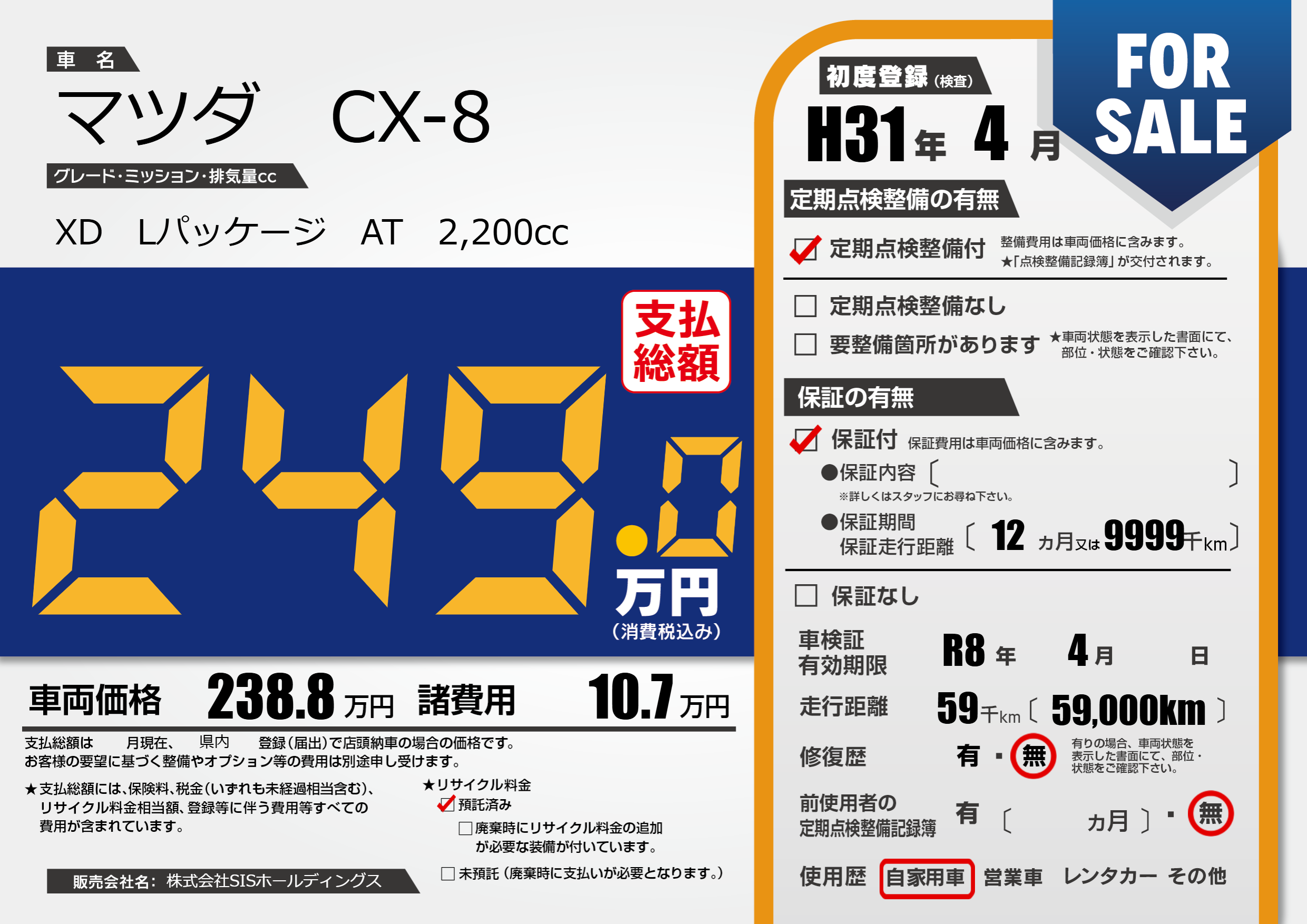 | 車名 | マツダ CX-8 | グレード ミッション 排気量 |