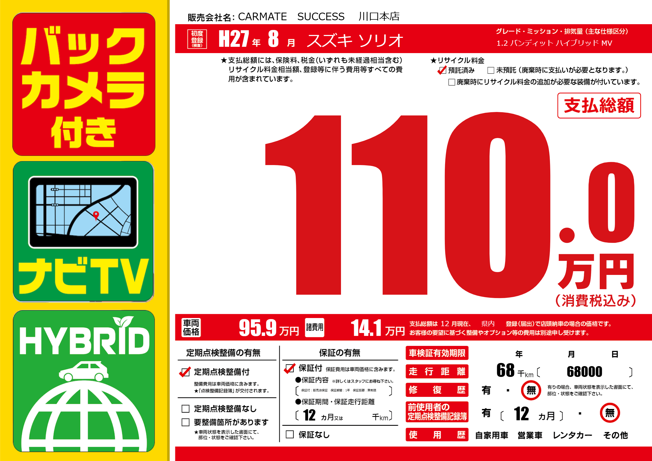| 車名 | スズキ ソリオ | グレード ミッション 排気量 |