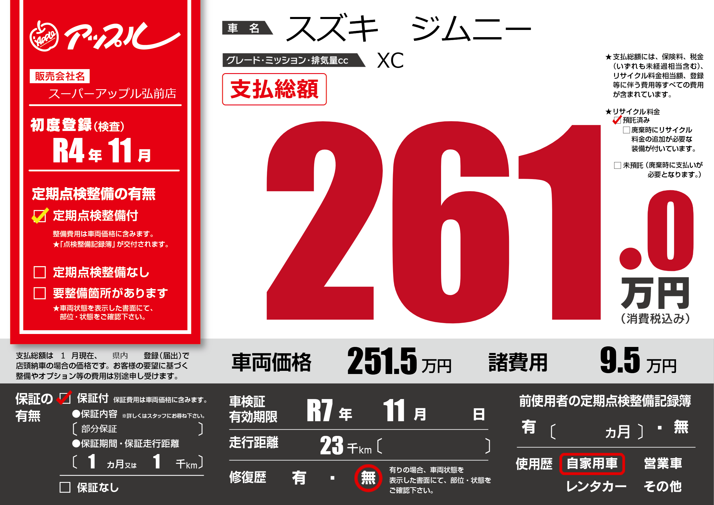 | 車名 | スズキ ジムニー | グレード ミッション 排気量 |