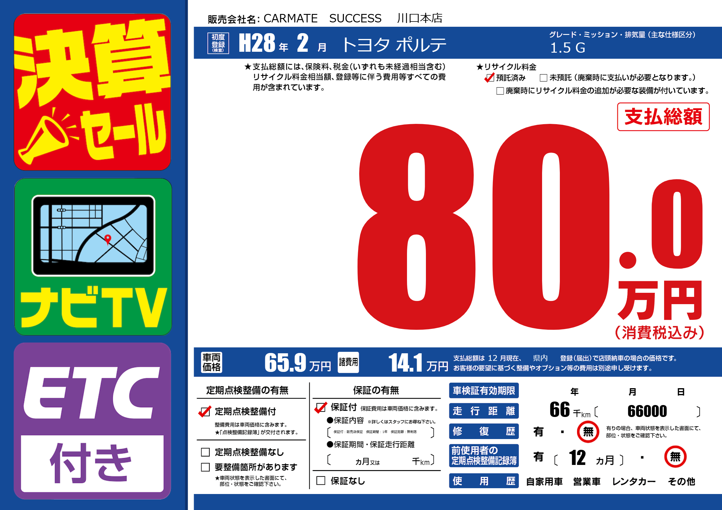 | 車名 | トヨタ ポルテ | グレード ミッション 排気量 |