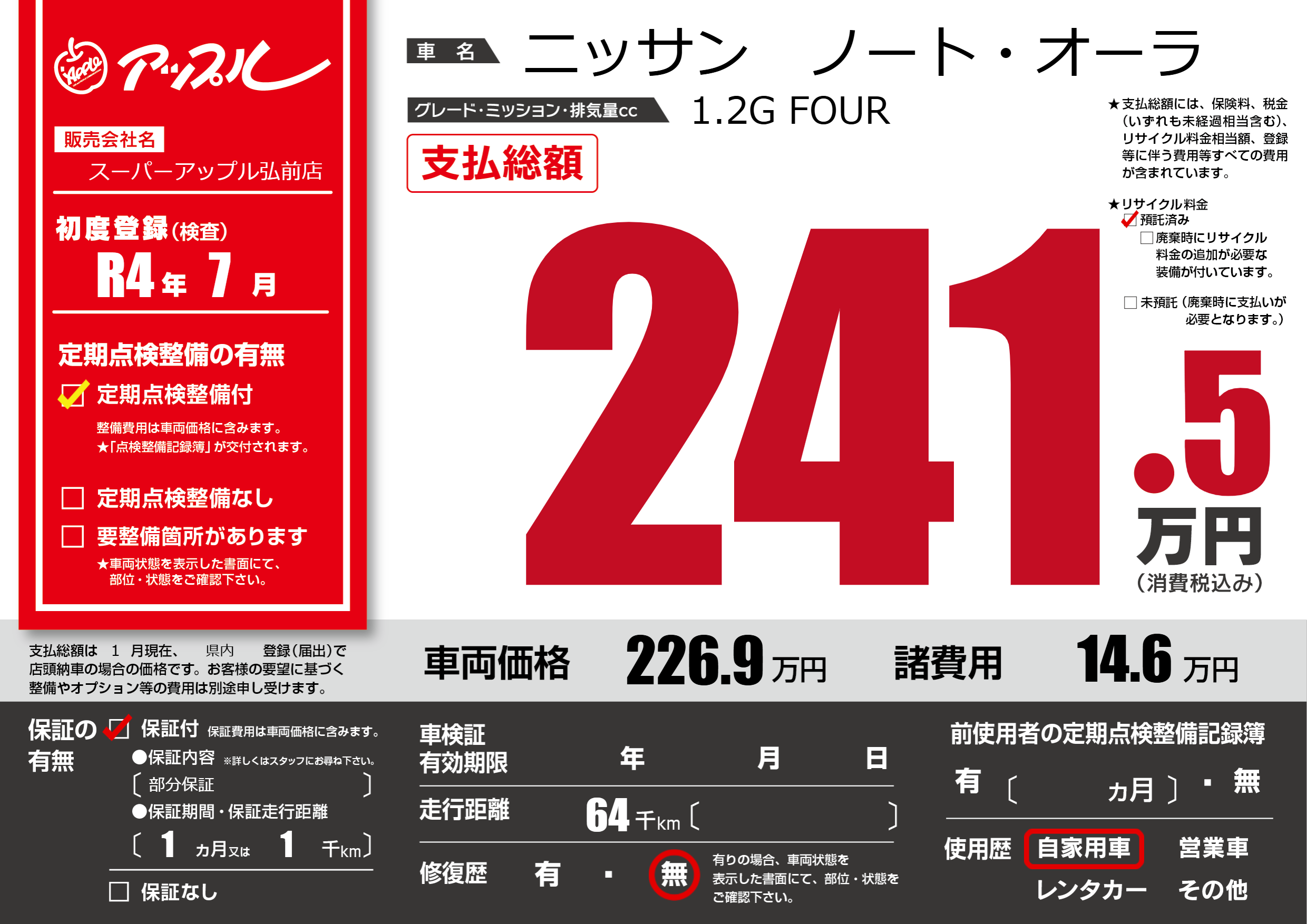 | 車名 | ニッサン ノート・オーラ | グレード ミッション 排気量 |