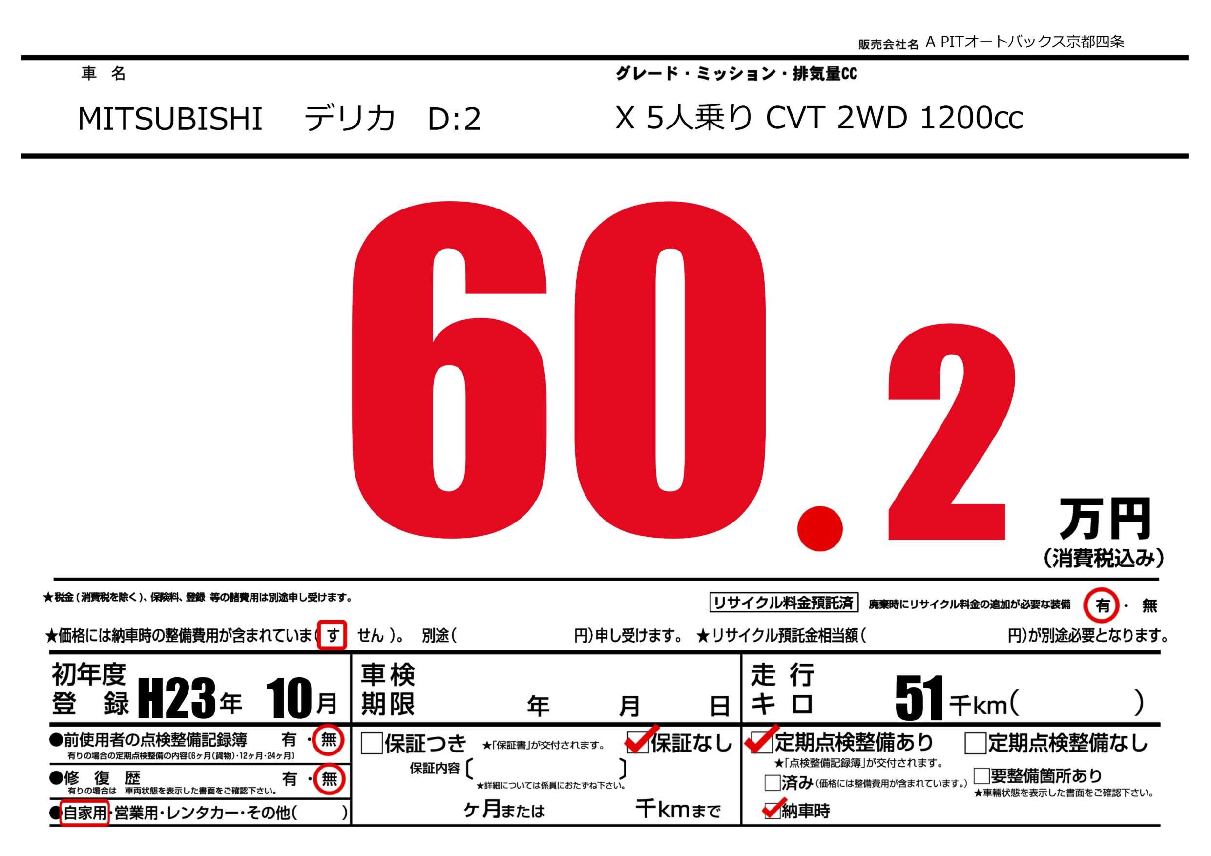 | 車名 | MITSUBISHI デリカ D:2 | グレード ミッション 排気量 |