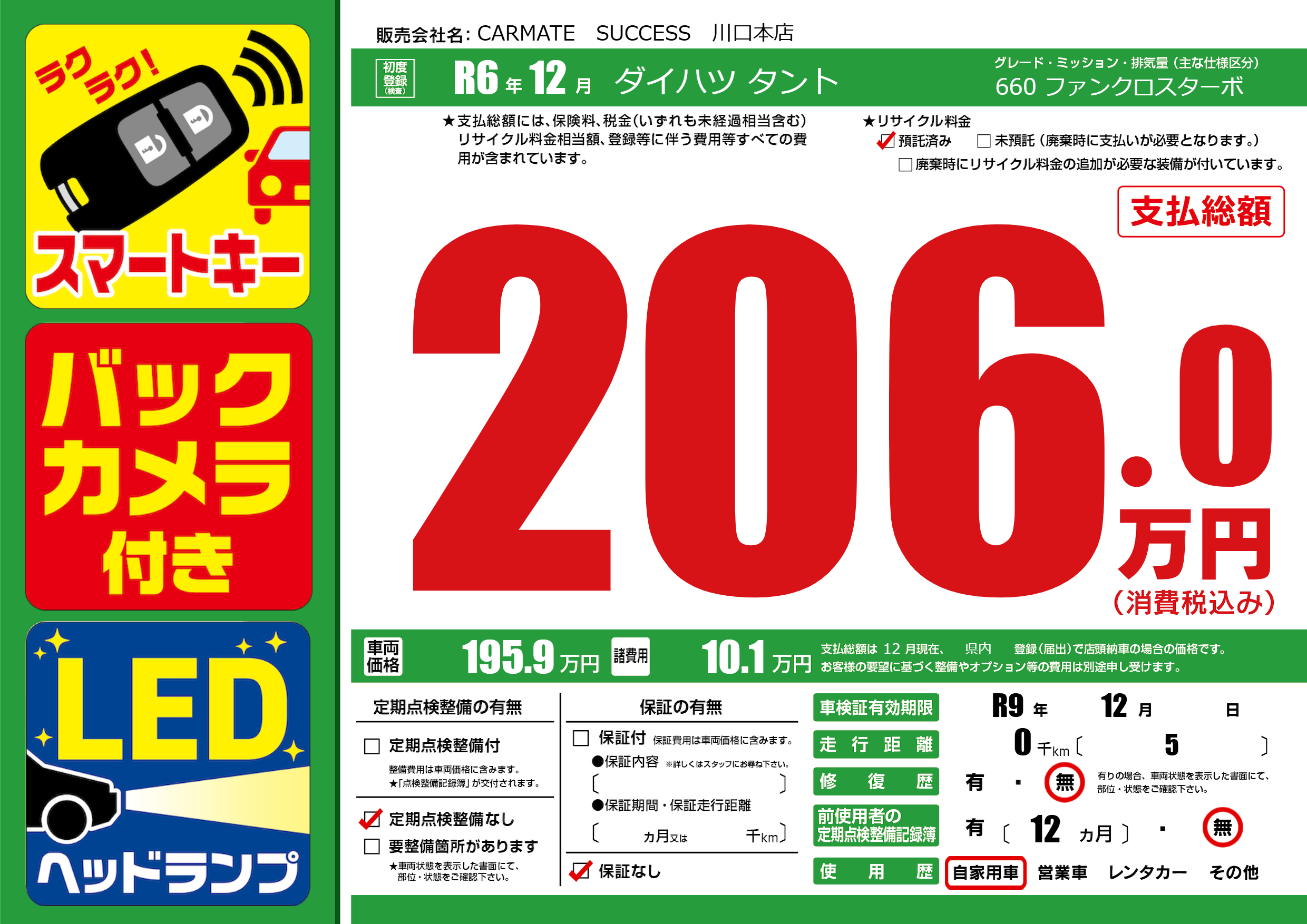 | 車名 | ダイハツ タント | グレード ミッション 排気量 |