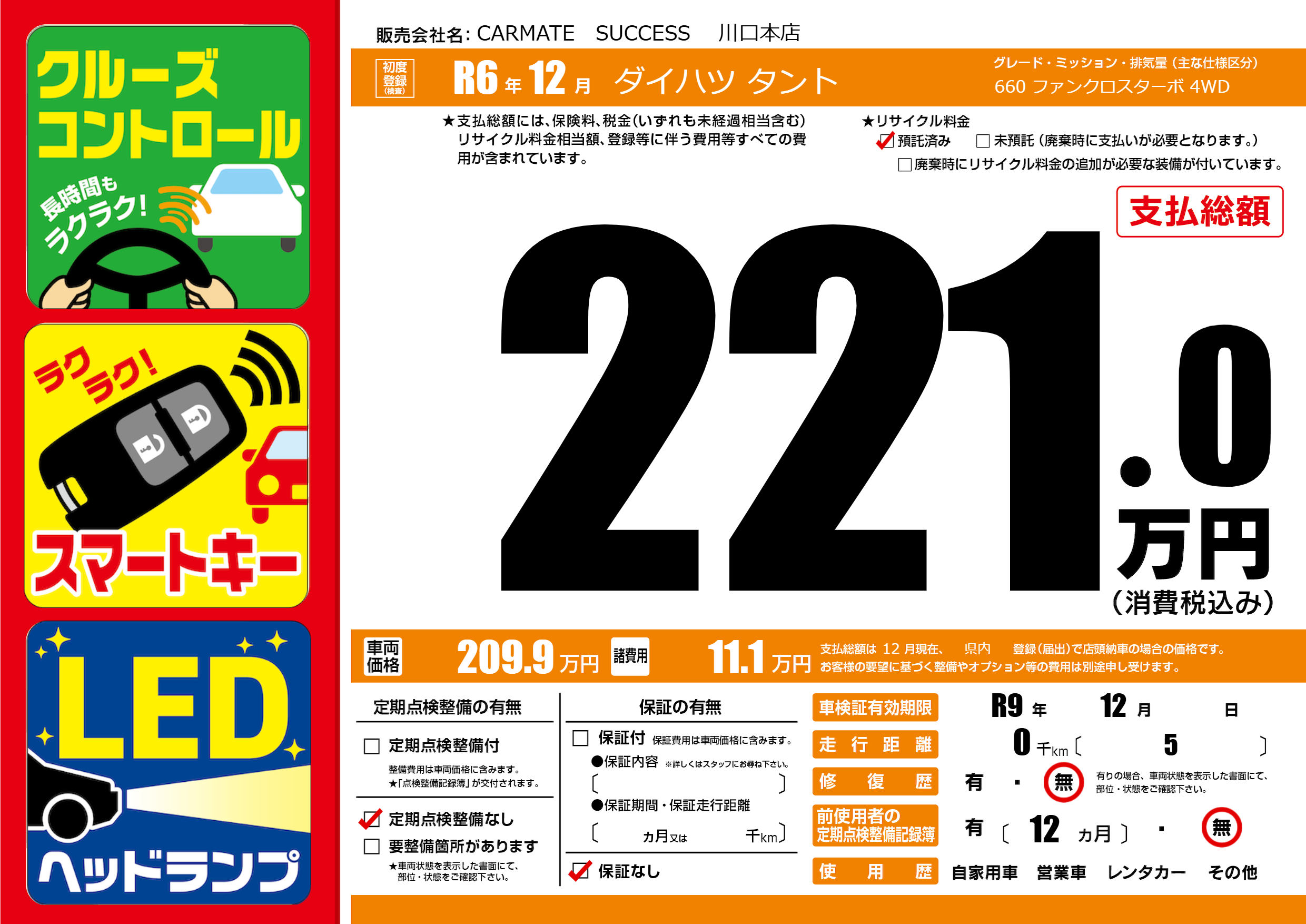 | 車名 | ダイハツ タント | グレード ミッション 排気量 |