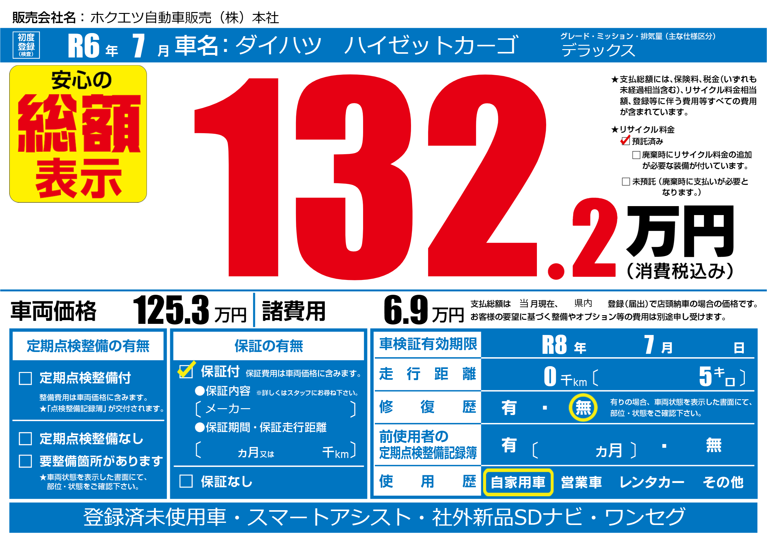| 車名 | ダイハツ ハイゼットカーゴ | グレード ミッション 排気量 |