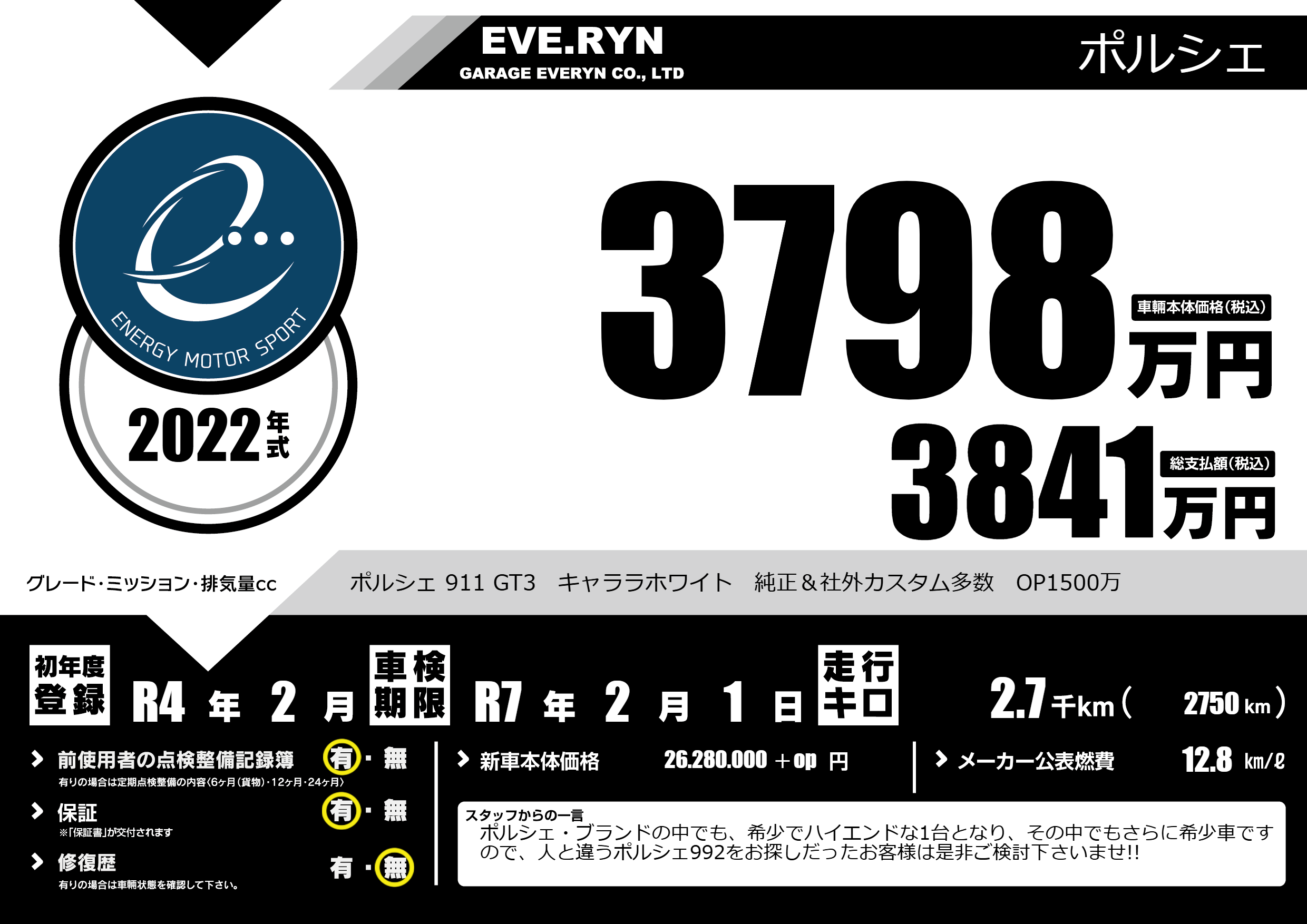 ポルシェ 911 GT3 キャララホワイト 純正&社外カスタム多数 OP1500万 |