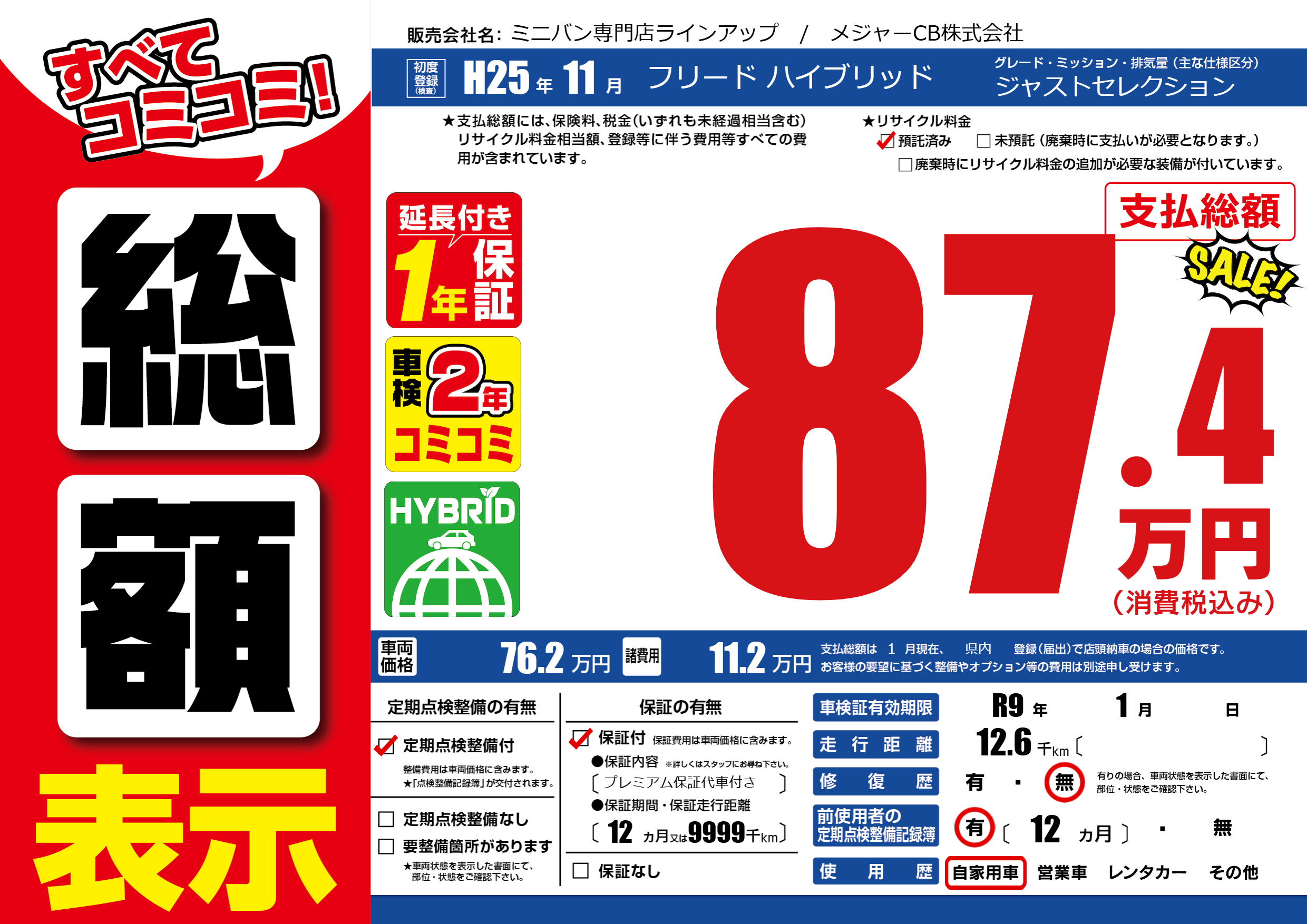保証付き 保証内容(プレミアム保証代車付き) 12ヶ月または(9999)千kmまで |